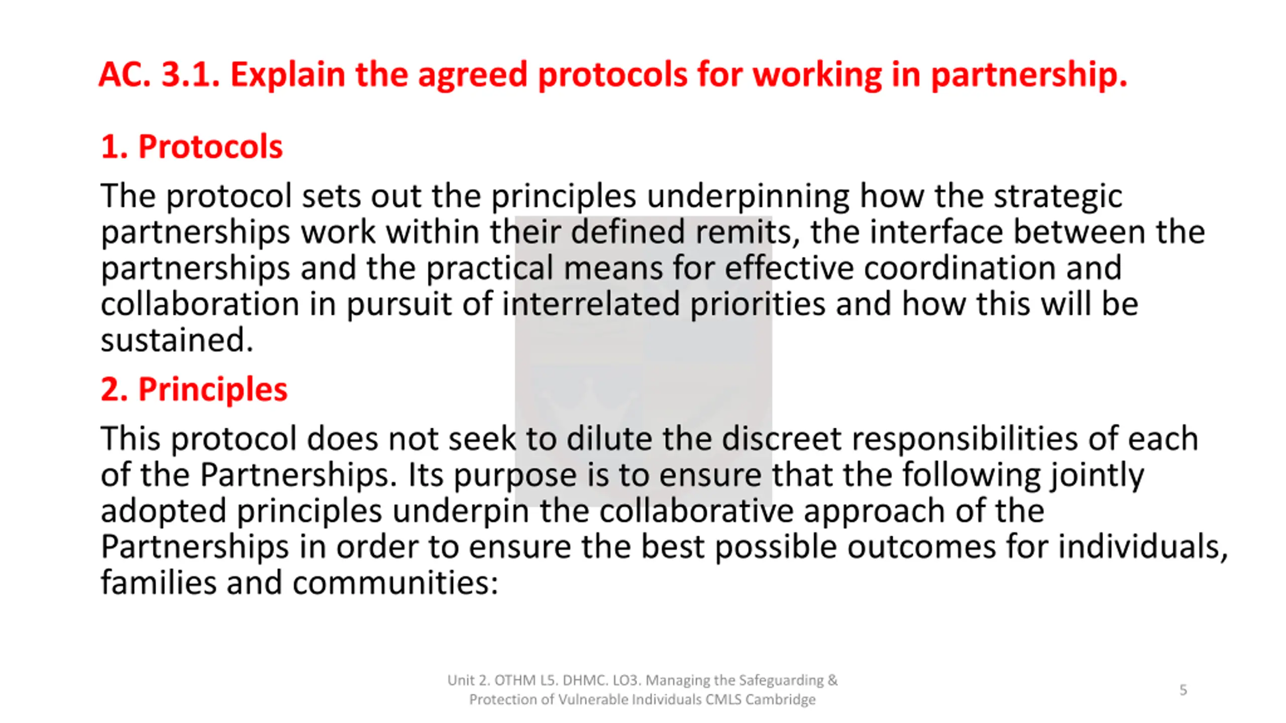 AC. 3.1. Explain the agreed protocols for working in partnership. 1. Protocols The protocol sets out the principles underpinning how the strategic partnerships work within their defined remits, the interface between the partnerships and the practical means for effective coordination and collaboration in pursuit of interrelated priorities and how this will be sustained. 2. Principles This protocol does not seek to dilute the discreet responsibilities of each of the Partnerships. Its purpose is to ensure that the following jointly adopted principles underpin the collaborative approach of the Partnerships in order to ensure the best possible outcomes for individuals, families and communities: Unit 2. OTHM L5. DHMC. LO3. Managing the Safeguarding & Protection of Vulnerable Individuals CMLS Cambridge 5