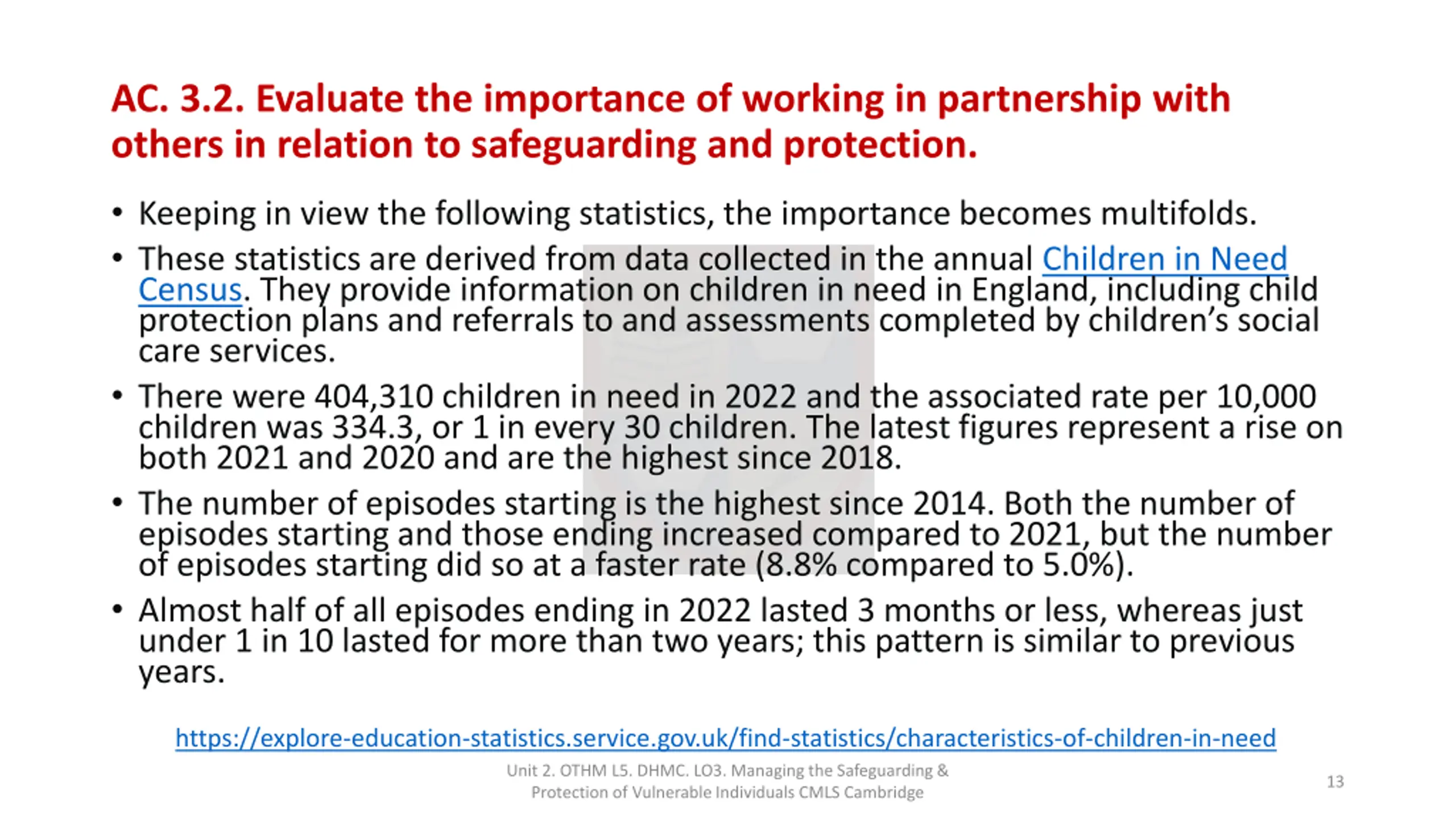 AC. 3.2. Evaluate the importance of working in partnership with others in relation to safeguarding and protection. Keeping in view the following statistics, the importance becomes multifolds. These statistics are derived from data collected in the annual Children in Need Census. They provide information on children in need in England, including child protection plans and referrals to and assessments completed by children s social care services. There were 404,310 children in need in 2022 and the associated rate per 10,000 children was 334.3, or 1 in every 30 children. The latest figures represent a rise on both 2021 and 2020 and are the highest since 2018. The number of episodes starting is the highest since 2014. Both the number of episodes starting and those ending increased compared to 2021, but the number of episodes starting did so at a faster rate (8.8% compared to 5.0%). Almost half of all episodes ending in 2022 lasted 3 months or less, whereas just under 1 in 10 lasted for more than two years; this pattern is similar to previous years. https://explore-education-statistics.service.gov.uk/find-statistics/characteristics-of-children-in-need Unit 2. OTHM L5. DHMC. LO3. Managing the Safeguarding & Protection of Vulnerable Individuals CMLS Cambridge 13