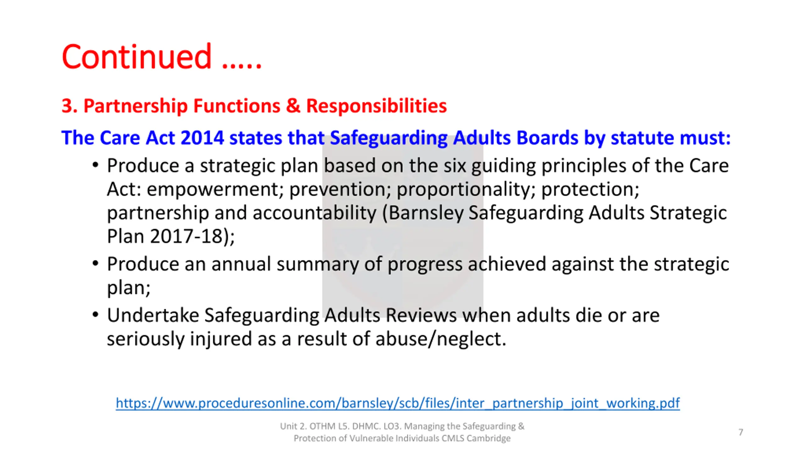 Continued .. Continued .. 3. Partnership Functions & Responsibilities The Care Act 2014 states that Safeguarding Adults Boards by statute must: Produce a strategic plan based on the six guiding principles of the Care Act: empowerment; prevention; proportionality; protection; partnership and accountability (Barnsley Safeguarding Adults Strategic Plan 2017-18); Produce an annual summary of progress achieved against the strategic plan; Undertake Safeguarding Adults Reviews when adults die or are seriously injured as a result of abuse/neglect. https://www.proceduresonline.com/barnsley/scb/files/inter_partnership_joint_working.pdf Unit 2. OTHM L5. DHMC. LO3. Managing the Safeguarding & Protection of Vulnerable Individuals CMLS Cambridge 7