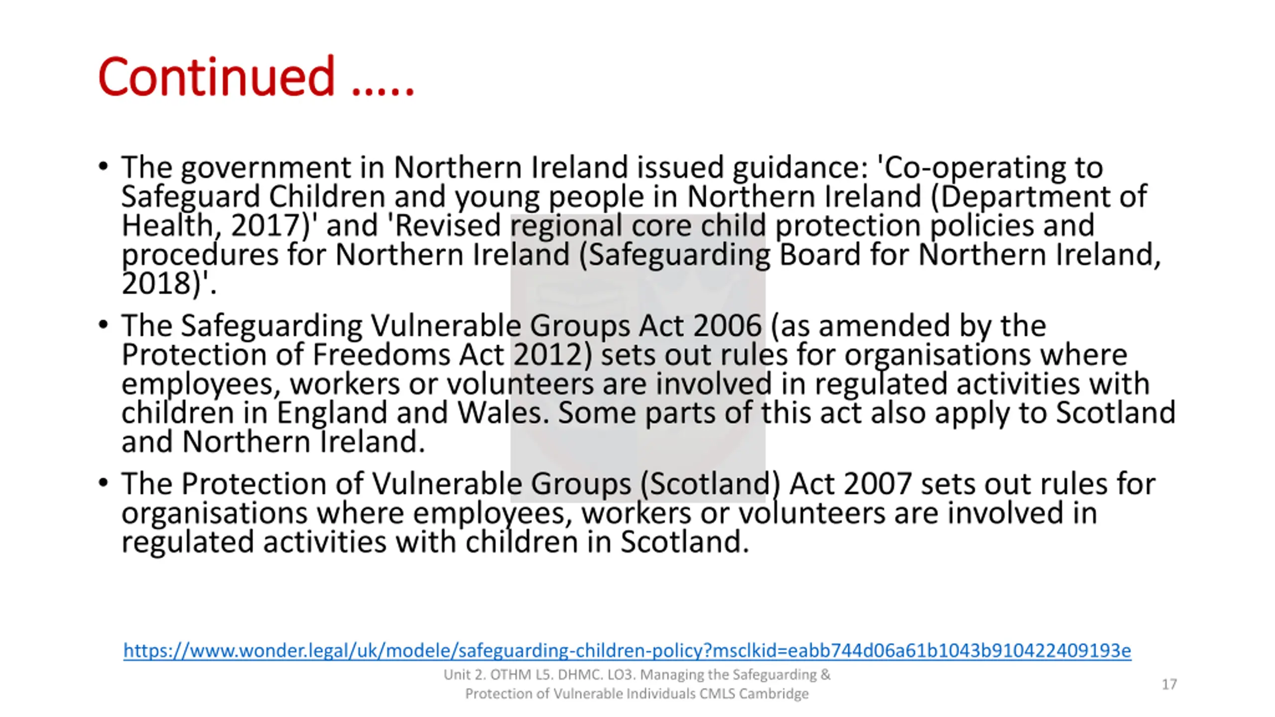 Continued .. Continued .. The government in Northern Ireland issued guidance: 'Co-operating to Safeguard Children and young people in Northern Ireland (Department of Health, 2017)' and 'Revised regional core child protection policies and procedures for Northern Ireland (Safeguarding Board for Northern Ireland, 2018)'. The Safeguarding Vulnerable Groups Act 2006 (as amended by the Protection of Freedoms Act 2012) sets out rules for organisations where employees, workers or volunteers are involved in regulated activities with children in England and Wales. Some parts of this act also apply to Scotland and Northern Ireland. The Protection of Vulnerable Groups (Scotland) Act 2007 sets out rules for organisations where employees, workers or volunteers are involved in regulated activities with children in Scotland. https://www.wonder.legal/uk/modele/safeguarding-children-policy?msclkid=eabb744d06a61b1043b910422409193e Unit 2. OTHM L5. DHMC. LO3. Managing the Safeguarding & Protection of Vulnerable Individuals CMLS Cambridge 17