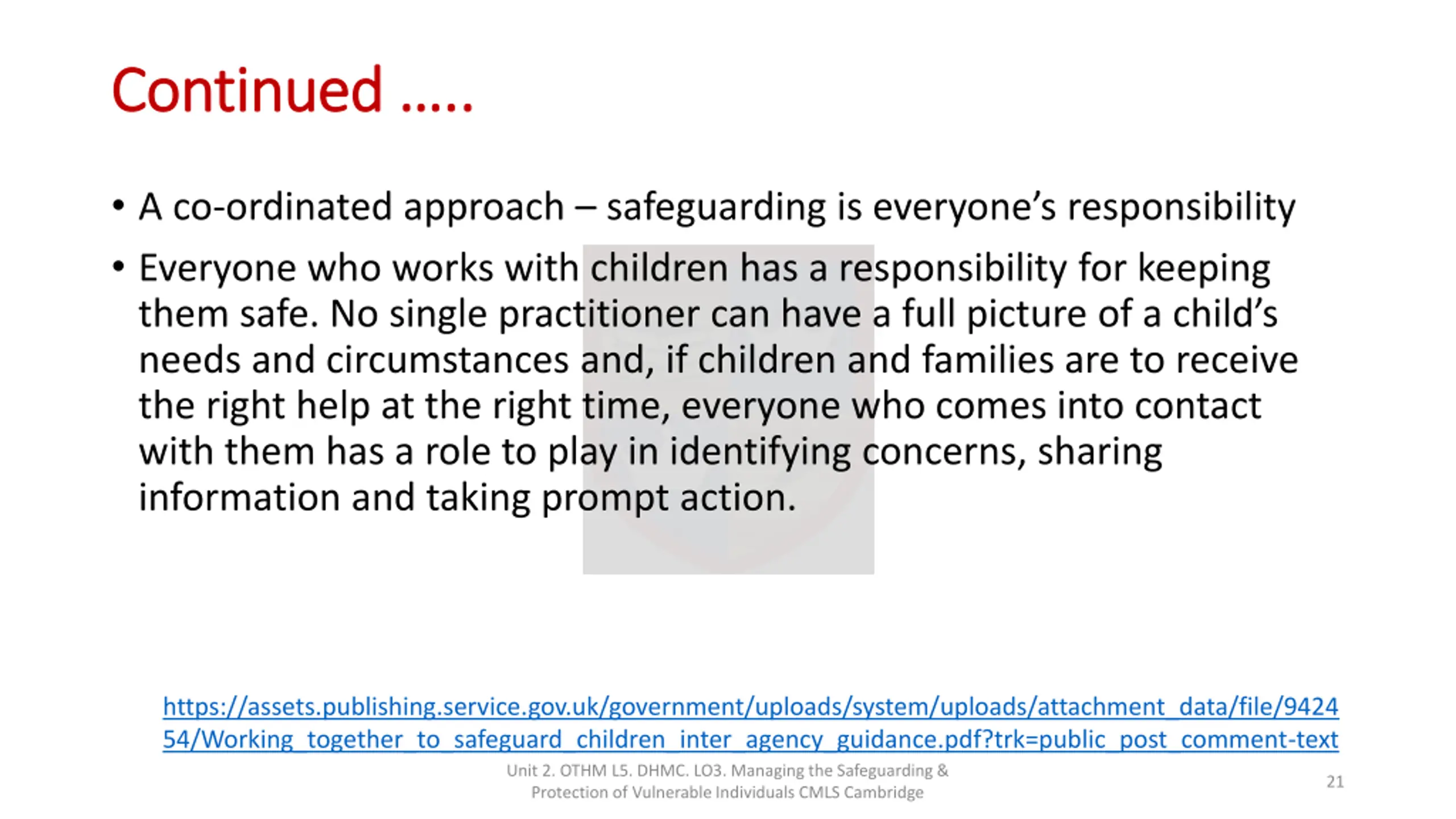 Continued .. Continued .. A co-ordinated approach safeguarding is everyone s responsibility Everyone who works with children has a responsibility for keeping them safe. No single practitioner can have a full picture of a child s needs and circumstances and, if children and families are to receive the right help at the right time, everyone who comes into contact with them has a role to play in identifying concerns, sharing information and taking prompt action. https://assets.publishing.service.gov.uk/government/uploads/system/uploads/attachment_data/file/9424 54/Working_together_to_safeguard_children_inter_agency_guidance.pdf?trk=public_post_comment-text Unit 2. OTHM L5. DHMC. LO3. Managing the Safeguarding & Protection of Vulnerable Individuals CMLS Cambridge 21
