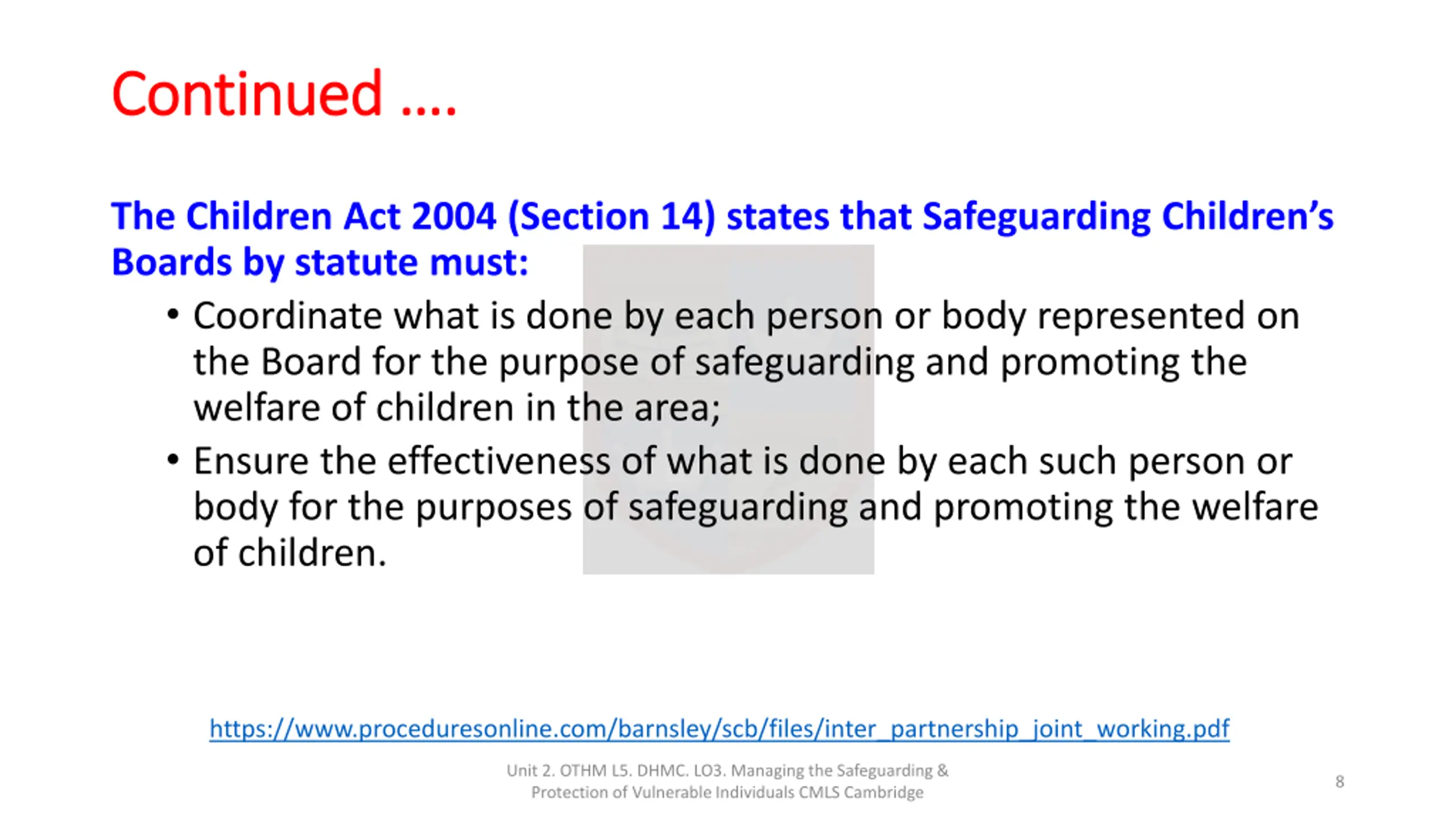 Continued . Continued . The Children Act 2004 (Section 14) states that Safeguarding Children s Boards by statute must: Coordinate what is done by each person or body represented on the Board for the purpose of safeguarding and promoting the welfare of children in the area; Ensure the effectiveness of what is done by each such person or body for the purposes of safeguarding and promoting the welfare of children. https://www.proceduresonline.com/barnsley/scb/files/inter_partnership_joint_working.pdf Unit 2. OTHM L5. DHMC. LO3. Managing the Safeguarding & Protection of Vulnerable Individuals CMLS Cambridge 8
