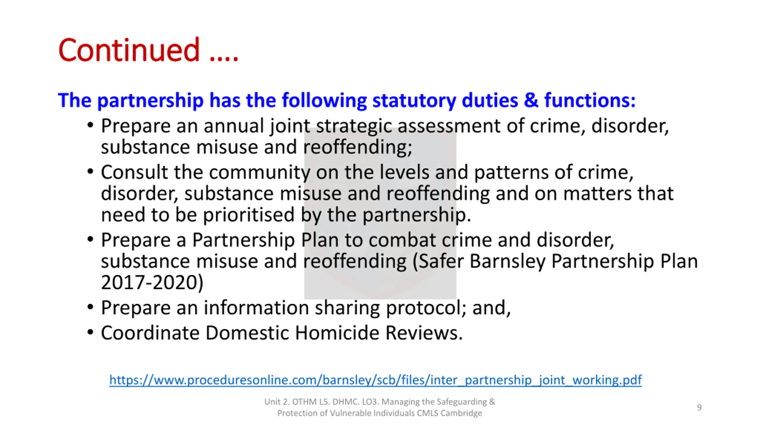 Continued . Continued . The partnership has the following statutory duties & functions: Prepare an annual joint strategic assessment of crime, disorder, substance misuse and reoffending; Consult the community on the levels and patterns of crime, disorder, substance misuse and reoffending and on matters that need to be prioritised by the partnership. Prepare a Partnership Plan to combat crime and disorder, substance misuse and reoffending (Safer Barnsley Partnership Plan 2017-2020) Prepare an information sharing protocol; and, Coordinate Domestic Homicide Reviews. https://www.proceduresonline.com/barnsley/scb/files/inter_partnership_joint_working.pdf Unit 2. OTHM L5. DHMC. LO3. Managing the Safeguarding & Protection of Vulnerable Individuals CMLS Cambridge 9