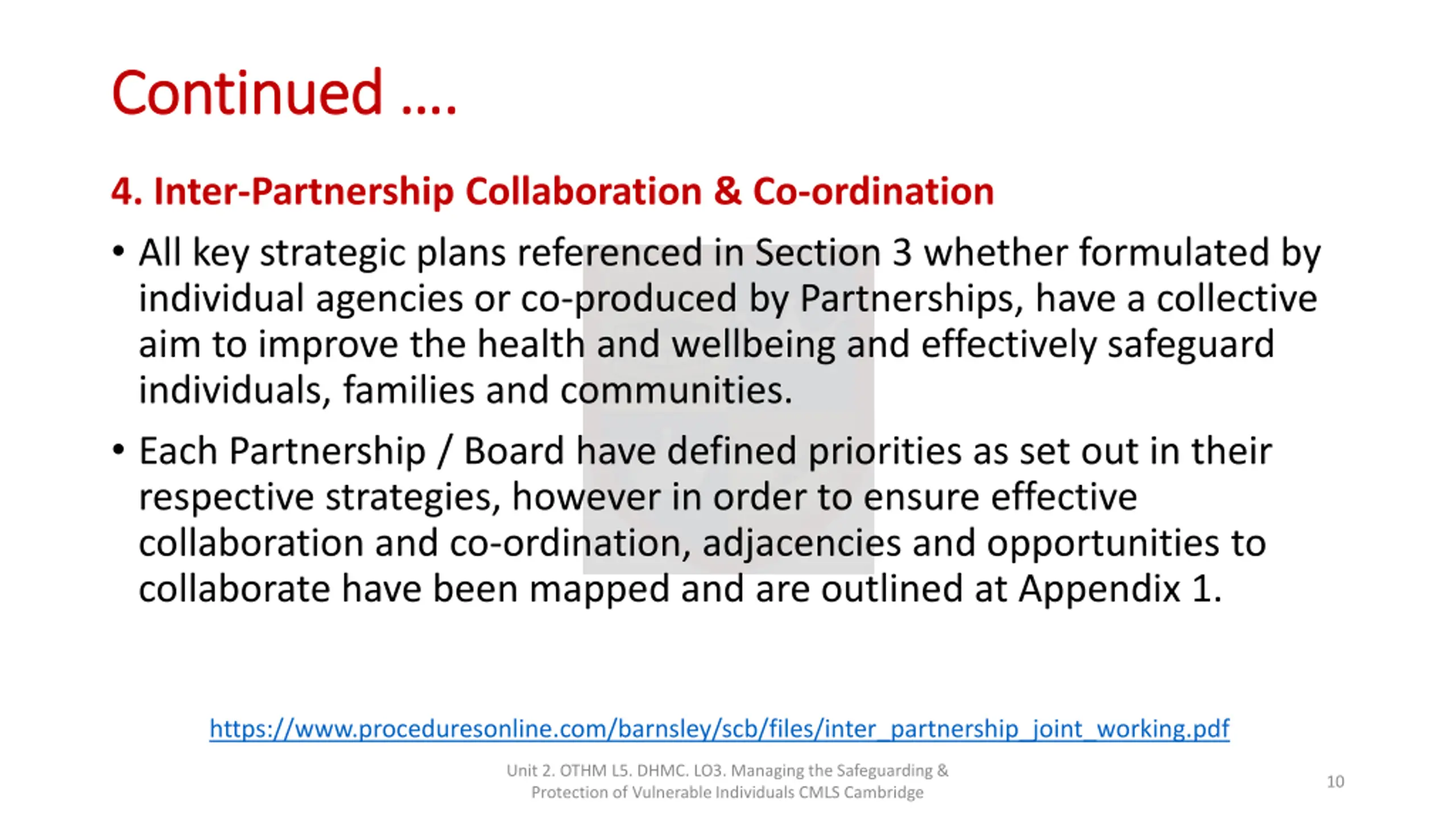 Continued . Continued . 4. Inter-Partnership Collaboration & Co-ordination All key strategic plans referenced in Section 3 whether formulated by individual agencies or co-produced by Partnerships, have a collective aim to improve the health and wellbeing and effectively safeguard individuals, families and communities. Each Partnership / Board have defined priorities as set out in their respective strategies, however in order to ensure effective collaboration and co-ordination, adjacencies and opportunities to collaborate have been mapped and are outlined at Appendix 1. https://www.proceduresonline.com/barnsley/scb/files/inter_partnership_joint_working.pdf Unit 2. OTHM L5. DHMC. LO3. Managing the Safeguarding & Protection of Vulnerable Individuals CMLS Cambridge 10