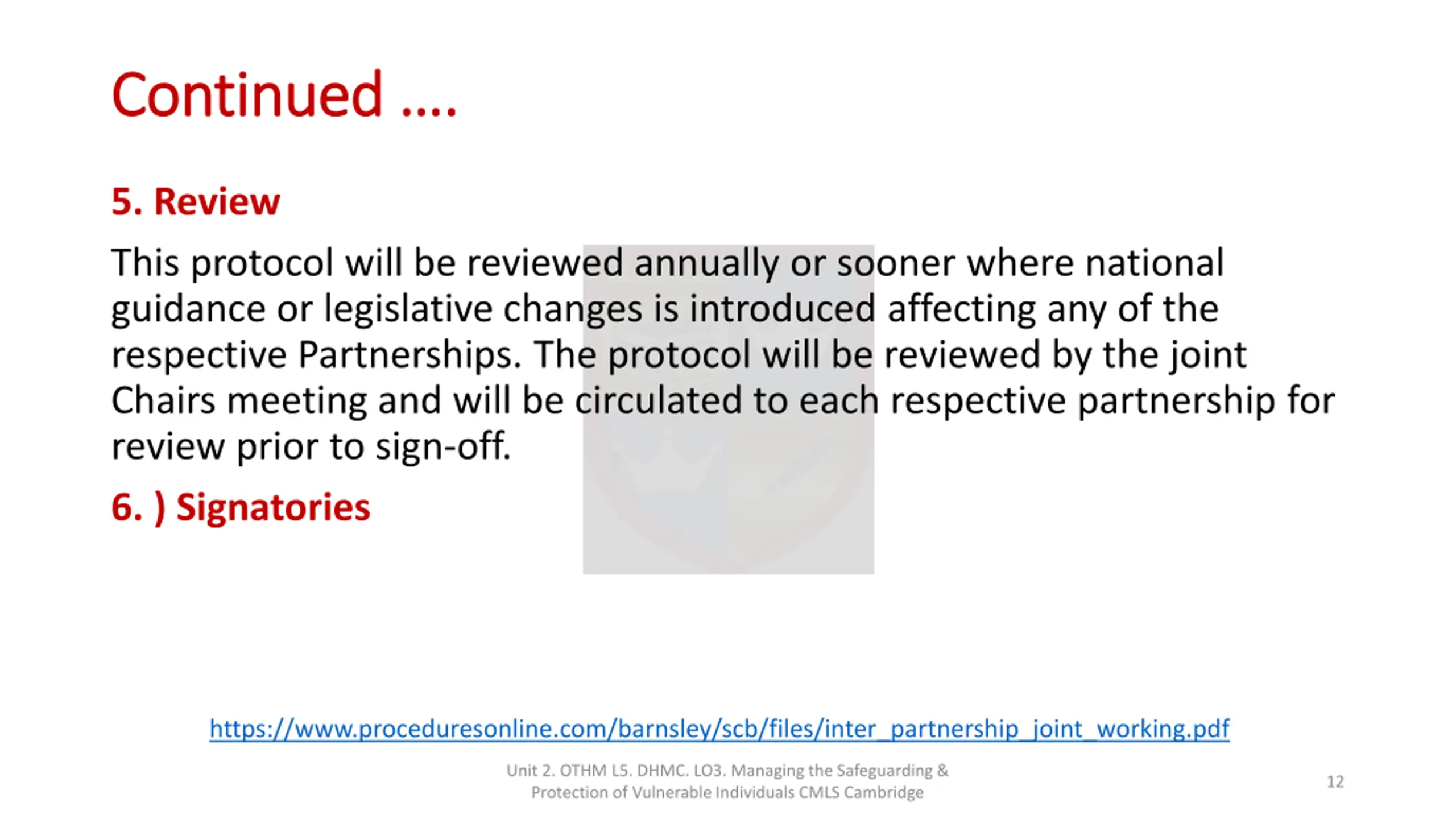 Continued . Continued . 5. Review This protocol will be reviewed annually or sooner where national guidance or legislative changes is introduced affecting any of the respective Partnerships. The protocol will be reviewed by the joint Chairs meeting and will be circulated to each respective partnership for review prior to sign-off. 6. ) Signatories https://www.proceduresonline.com/barnsley/scb/files/inter_partnership_joint_working.pdf Unit 2. OTHM L5. DHMC. LO3. Managing the Safeguarding & Protection of Vulnerable Individuals CMLS Cambridge 12