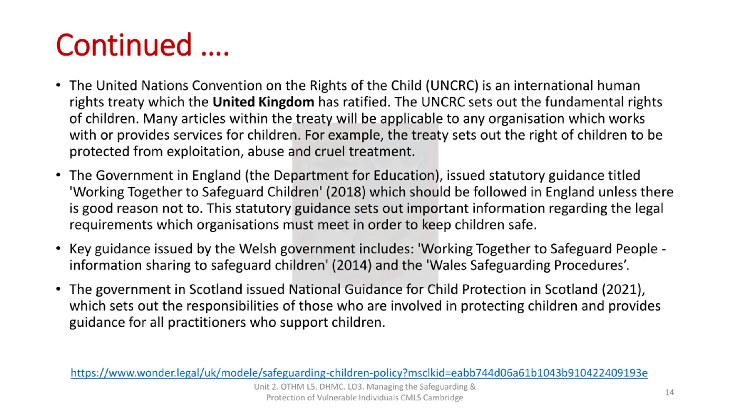 Continued . Continued . The United Nations Convention on the Rights of the Child (UNCRC) is an international human rights treaty which the United Kingdom has ratified. The UNCRC sets out the fundamental rights of children. Many articles within the treaty will be applicable to any organisation which works with or provides services for children. For example, the treaty sets out the right of children to be protected from exploitation, abuse and cruel treatment. The Government in England (the Department for Education), issued statutory guidance titled 'Working Together to Safeguard Children' (2018) which should be followed in England unless there is good reason not to. This statutory guidance sets out important information regarding the legal requirements which organisations must meet in order to keep children safe. Key guidance issued by the Welsh government includes: 'Working Together to Safeguard People - information sharing to safeguard children' (2014) and the 'Wales Safeguarding Procedures . The government in Scotland issued National Guidance for Child Protection in Scotland (2021), which sets out the responsibilities of those who are involved in protecting children and provides guidance for all practitioners who support children. https://www.wonder.legal/uk/modele/safeguarding-children-policy?msclkid=eabb744d06a61b1043b910422409193e Unit 2. OTHM L5. DHMC. LO3. Managing the Safeguarding & Protection of Vulnerable Individuals CMLS Cambridge 14
