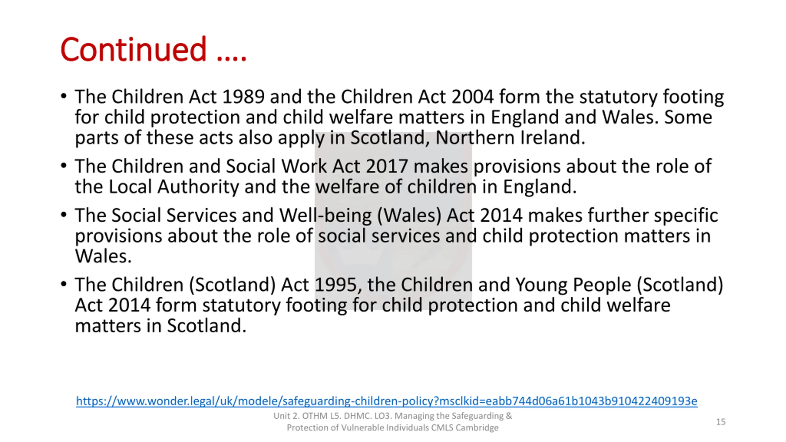 Continued . Continued . The Children Act 1989 and the Children Act 2004 form the statutory footing for child protection and child welfare matters in England and Wales. Some parts of these acts also apply in Scotland, Northern Ireland. The Children and Social Work Act 2017 makes provisions about the role of the Local Authority and the welfare of children in England. The Social Services and Well-being (Wales) Act 2014 makes further specific provisions about the role of social services and child protection matters in Wales. The Children (Scotland) Act 1995, the Children and Young People (Scotland) Act 2014 form statutory footing for child protection and child welfare matters in Scotland. https://www.wonder.legal/uk/modele/safeguarding-children-policy?msclkid=eabb744d06a61b1043b910422409193e Unit 2. OTHM L5. DHMC. LO3. Managing the Safeguarding & Protection of Vulnerable Individuals CMLS Cambridge 15