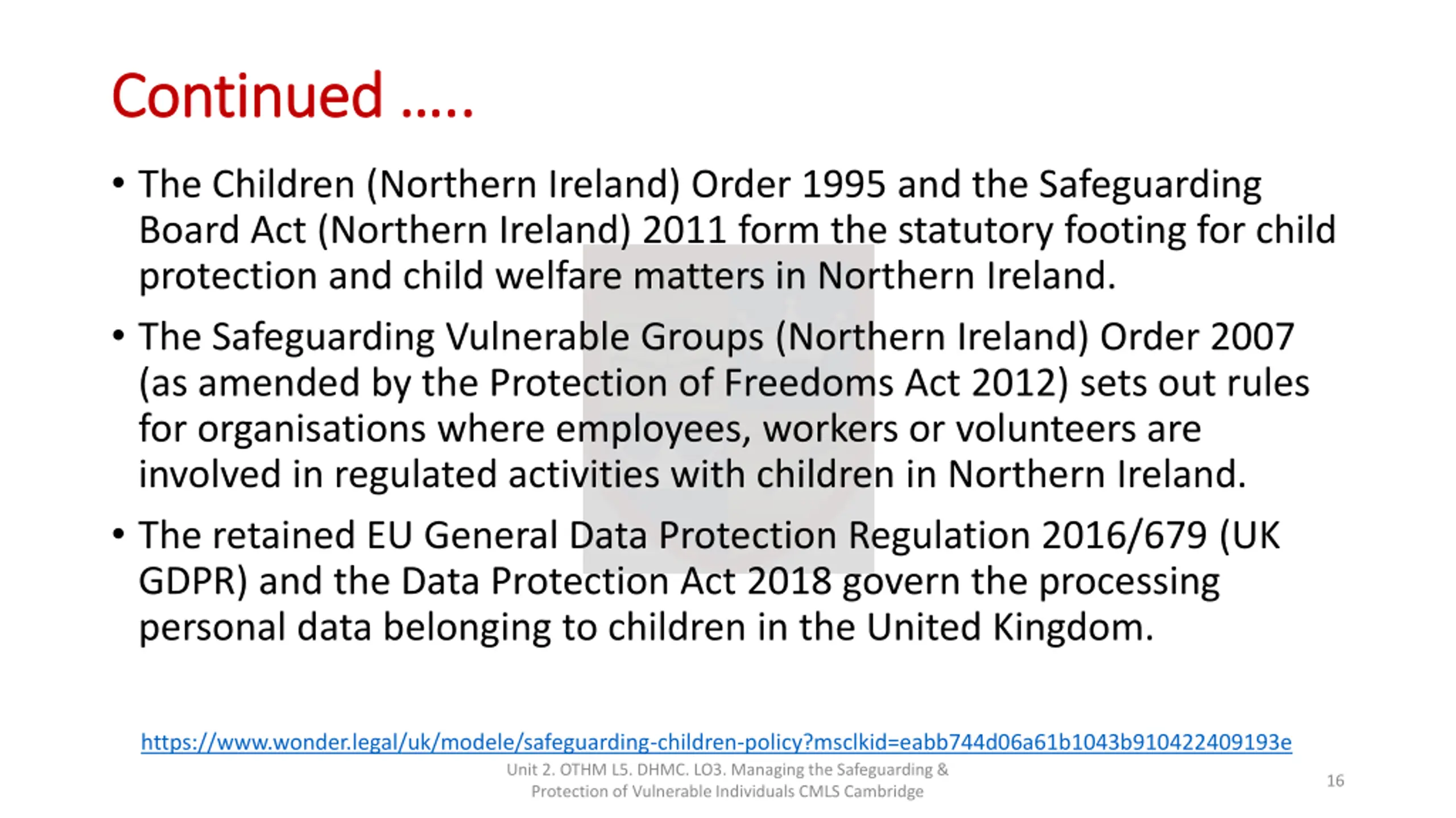 Continued .. Continued .. The Children (Northern Ireland) Order 1995 and the Safeguarding Board Act (Northern Ireland) 2011 form the statutory footing for child protection and child welfare matters in Northern Ireland. The Safeguarding Vulnerable Groups (Northern Ireland) Order 2007 (as amended by the Protection of Freedoms Act 2012) sets out rules for organisations where employees, workers or volunteers are involved in regulated activities with children in Northern Ireland. The retained EU General Data Protection Regulation 2016/679 (UK GDPR) and the Data Protection Act 2018 govern the processing personal data belonging to children in the United Kingdom. https://www.wonder.legal/uk/modele/safeguarding-children-policy?msclkid=eabb744d06a61b1043b910422409193e Unit 2. OTHM L5. DHMC. LO3. Managing the Safeguarding & Protection of Vulnerable Individuals CMLS Cambridge 16