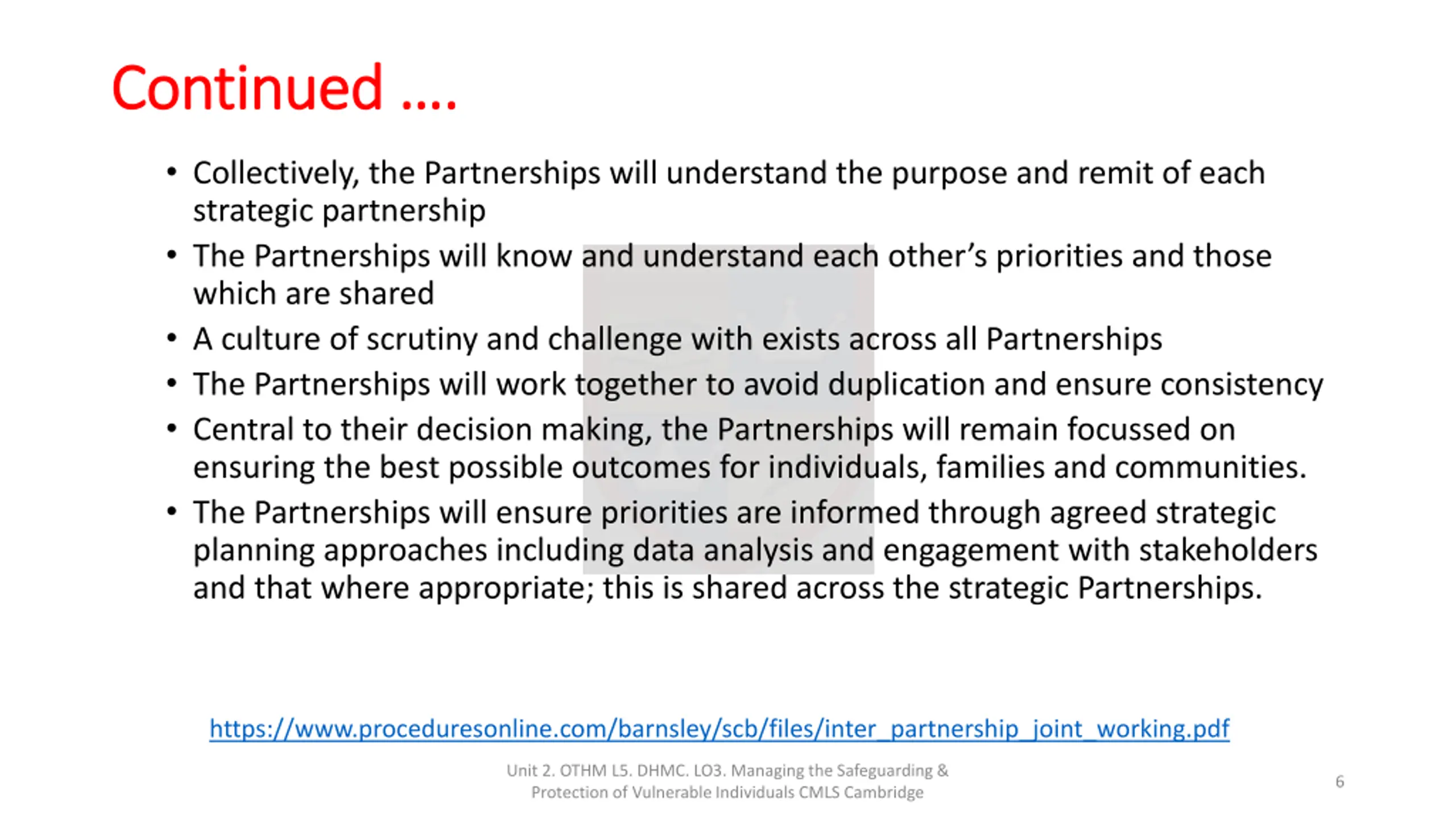 Continued . Continued . Collectively, the Partnerships will understand the purpose and remit of each strategic partnership The Partnerships will know and understand each other s priorities and those which are shared A culture of scrutiny and challenge with exists across all Partnerships The Partnerships will work together to avoid duplication and ensure consistency Central to their decision making, the Partnerships will remain focussed on ensuring the best possible outcomes for individuals, families and communities. The Partnerships will ensure priorities are informed through agreed strategic planning approaches including data analysis and engagement with stakeholders and that where appropriate; this is shared across the strategic Partnerships. https://www.proceduresonline.com/barnsley/scb/files/inter_partnership_joint_working.pdf Unit 2. OTHM L5. DHMC. LO3. Managing the Safeguarding & Protection of Vulnerable Individuals CMLS Cambridge 6