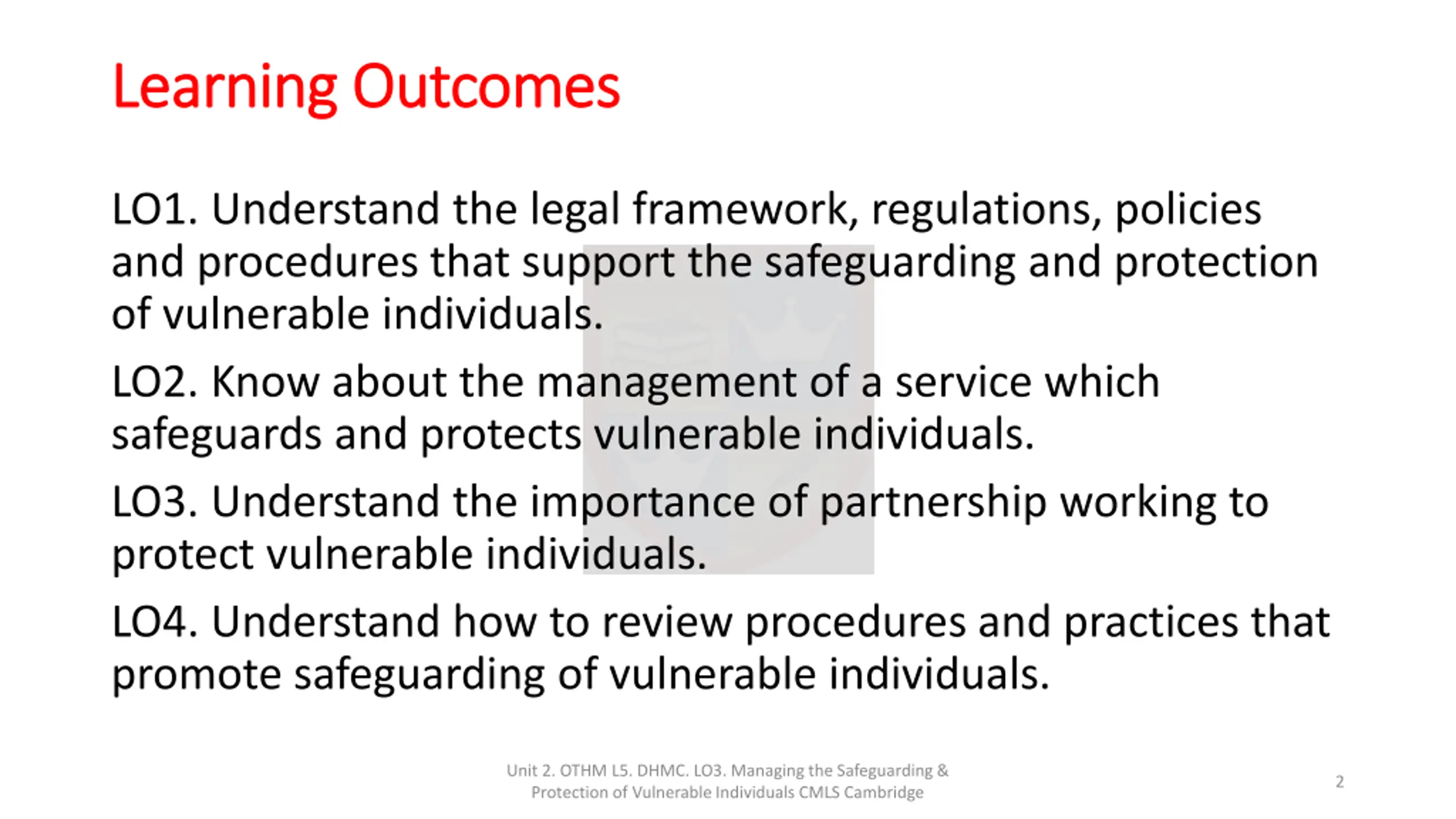 Learning Outcomes Learning Outcomes LO1. Understand the legal framework, regulations, policies and procedures that support the safeguarding and protection of vulnerable individuals. LO2. Know about the management of a service which safeguards and protects vulnerable individuals. LO3. Understand the importance of partnership working to protect vulnerable individuals. LO4. Understand how to review procedures and practices that promote safeguarding of vulnerable individuals. Unit 2. OTHM L5. DHMC. LO3. Managing the Safeguarding & Protection of Vulnerable Individuals CMLS Cambridge 2