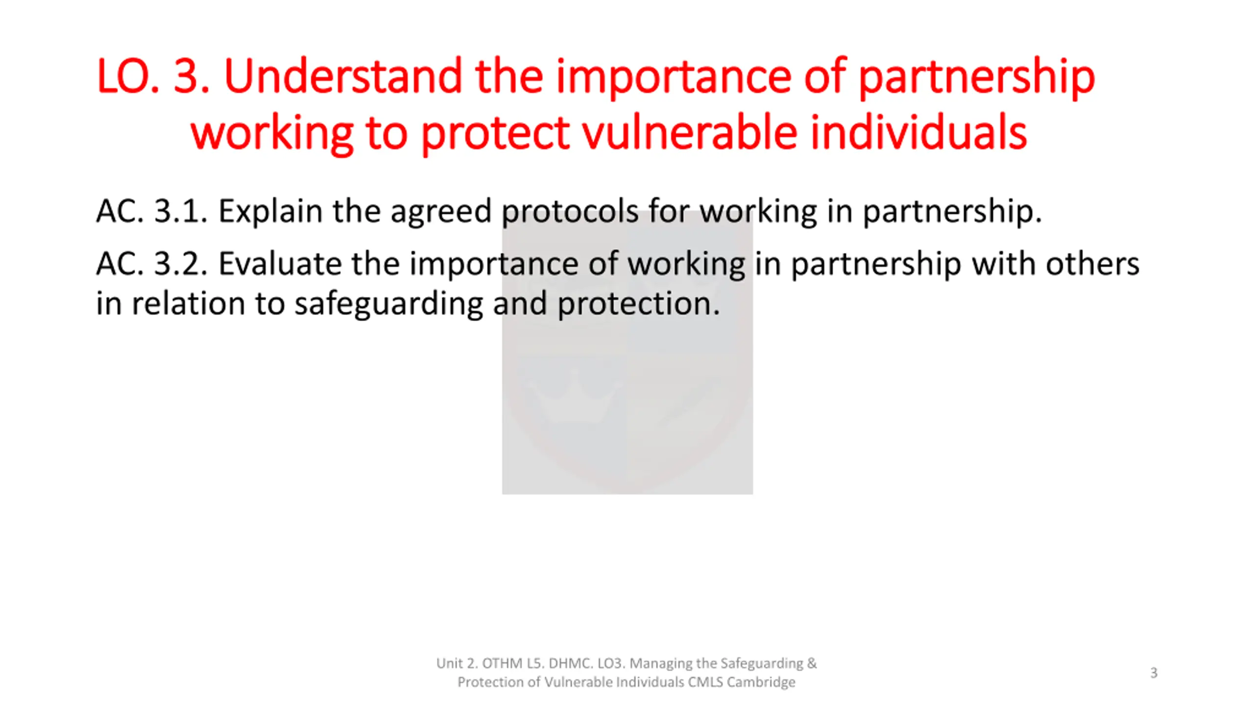 LO. 3. Understand the importance of partnership LO. 3. Understand the importance of partnership working to protect vulnerable individuals working to protect vulnerable individuals AC. 3.1. Explain the agreed protocols for working in partnership. AC. 3.2. Evaluate the importance of working in partnership with others in relation to safeguarding and protection. Unit 2. OTHM L5. DHMC. LO3. Managing the Safeguarding & Protection of Vulnerable Individuals CMLS Cambridge 3