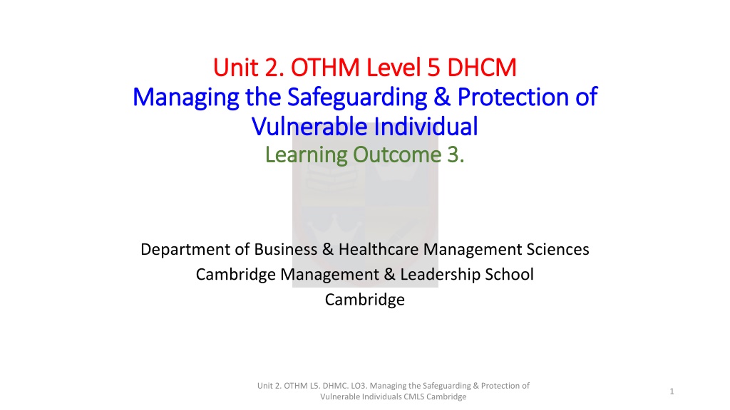 Unit 2. Unit 2. OTHM Level 5 DHCM OTHM Level 5 DHCM Managing the Safeguarding & Protection of Managing the Safeguarding & Protection of Vulnerable Individual Vulnerable Individual Learning Outcome 3. Learning Outcome 3. Department of Business & Healthcare Management Sciences Cambridge Management & Leadership School Cambridge Unit 2. OTHM L5. DHMC. LO3. Managing the Safeguarding & Protection of Vulnerable Individuals CMLS Cambridge 1