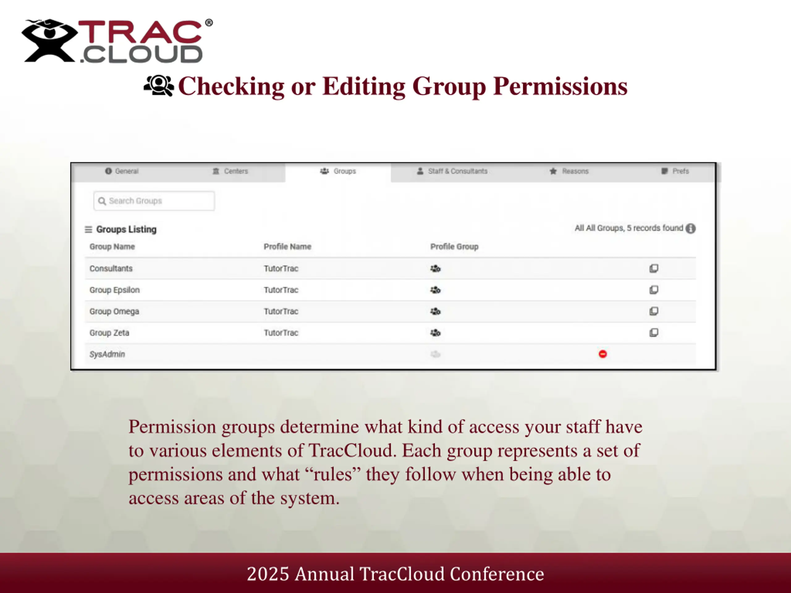 Checking or Editing Group Permissions Permission groups determine what kind of access your staff have to various elements of TracCloud. Each group represents a set of permissions and what rules they follow when being able to access areas of the system. 2025 Annual TracCloud Conference 2025 Annual TracCloud Conference