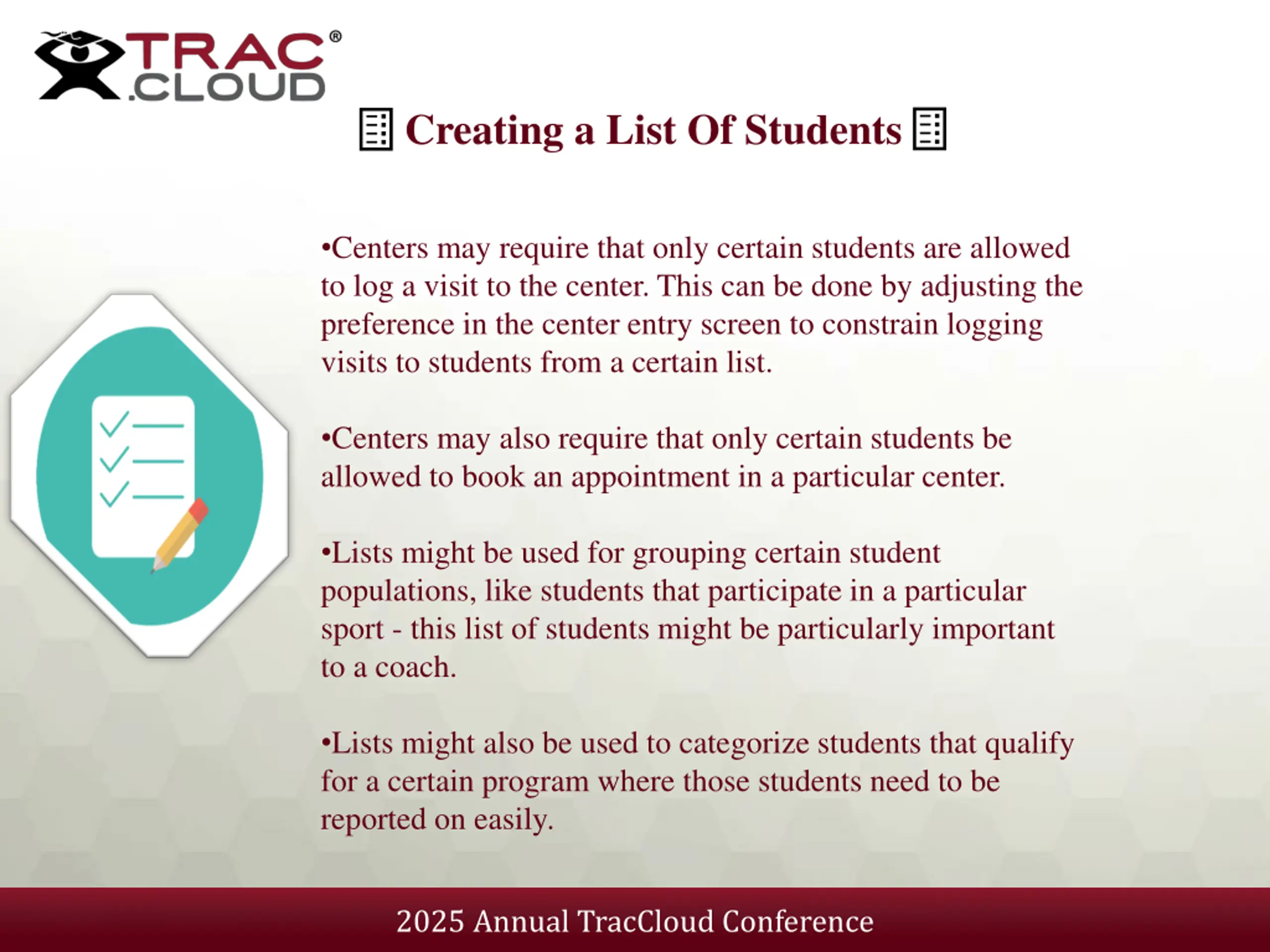 Creating a List Of Students Centers may require that only certain students are allowed to log a visit to the center. This can be done by adjusting the preference in the center entry screen to constrain logging visits to students from a certain list. Centers may also require that only certain students be allowed to book an appointment in a particular center. Lists might be used for grouping certain student populations, like students that participate in a particular sport - this list of students might be particularly important to a coach. Lists might also be used to categorize students that qualify for a certain program where those students need to be reported on easily. 2025 Annual TracCloud Conference 2025 Annual TracCloud Conference