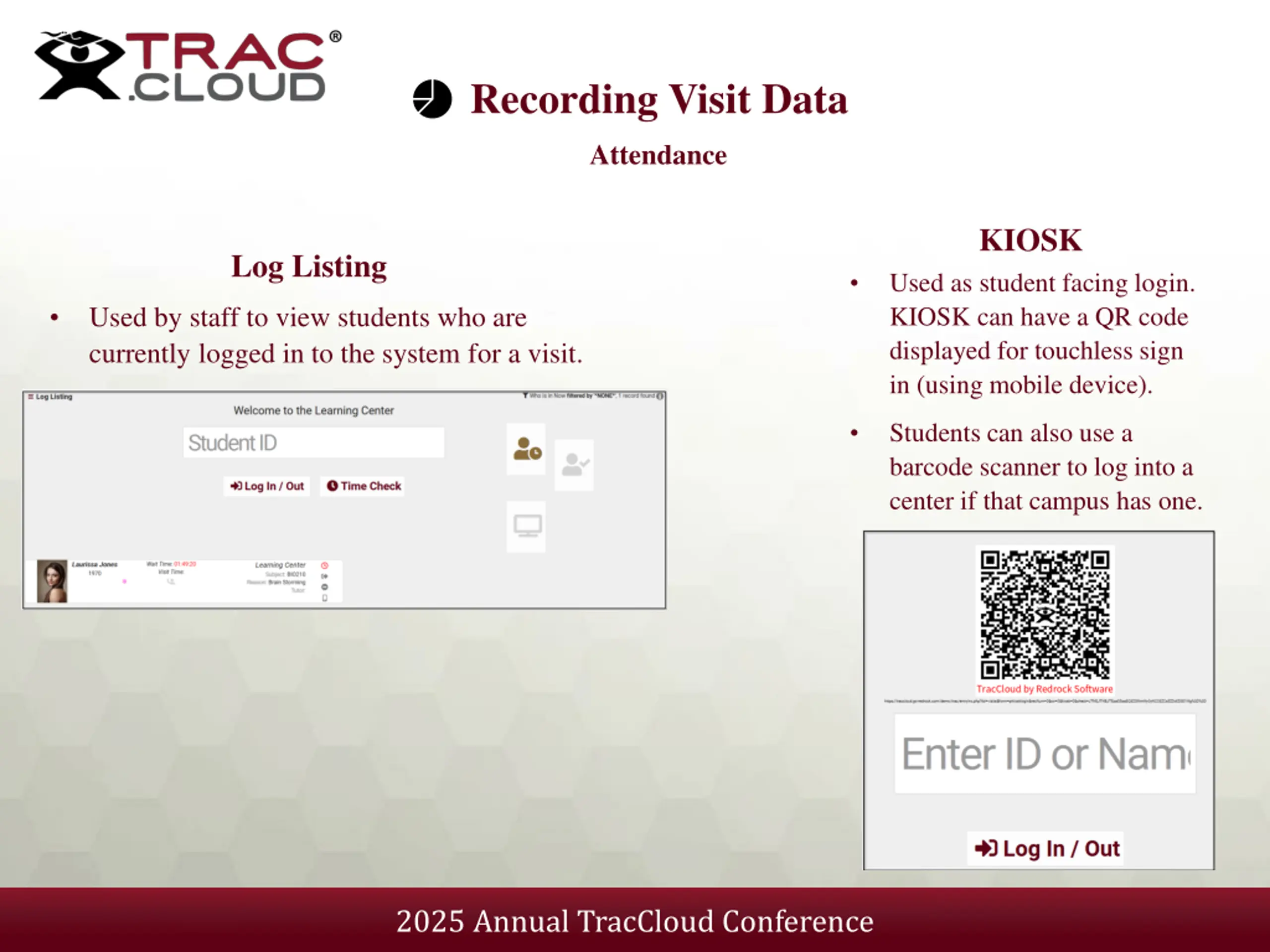 Recording Visit Data Attendance KIOSK Log Listing Used as student facing login. KIOSK can have a QR code displayed for touchless sign in (using mobile device). Used by staff to view students who are currently logged in to the system for a visit. Students can also use a barcode scanner to log into a center if that campus has one. 2025 Annual TracCloud Conference 2025 Annual TracCloud Conference