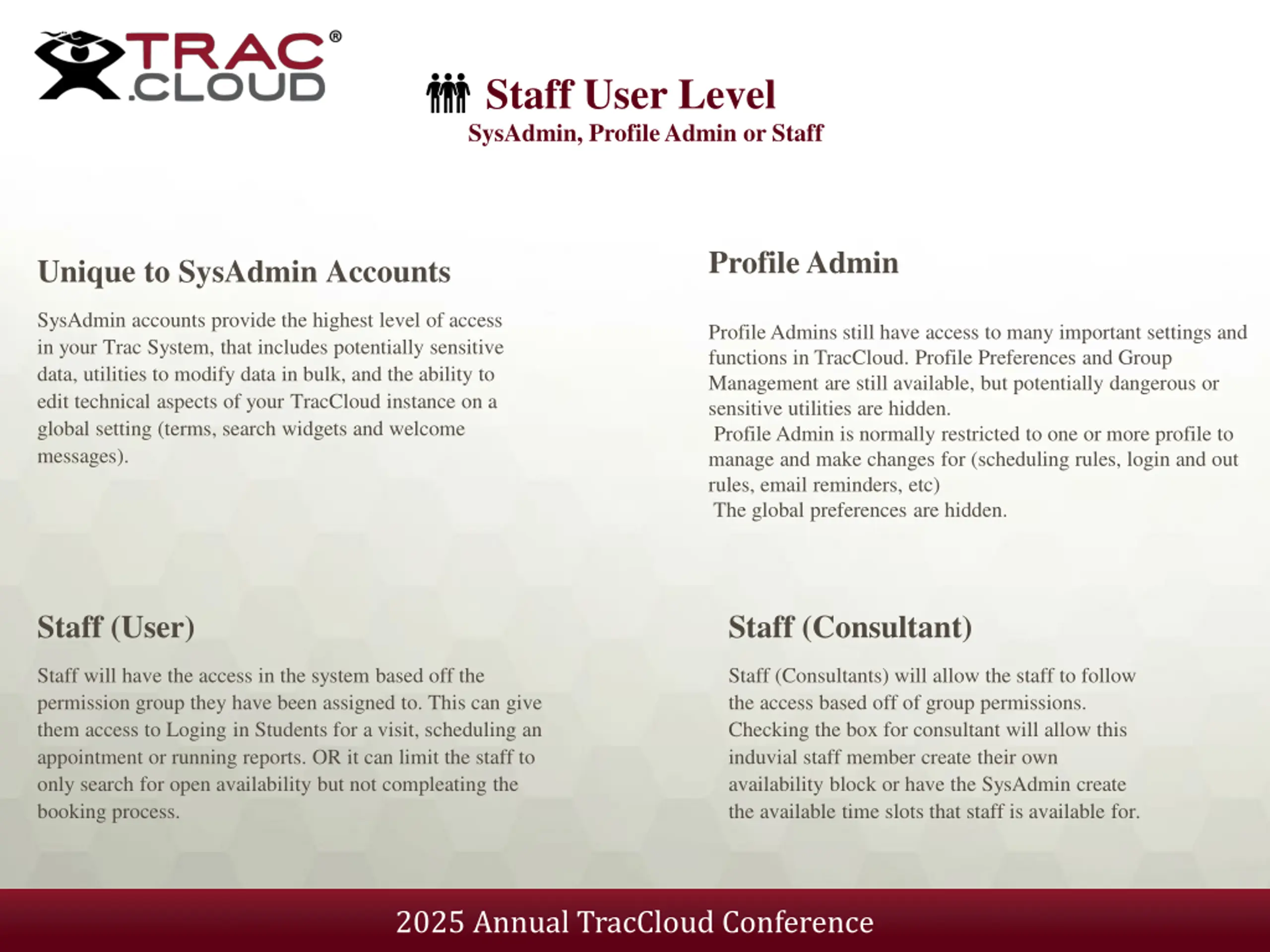 Staff User Level SysAdmin, Profile Admin or Staff Profile Admin Unique to SysAdmin Accounts SysAdmin accounts provide the highest level of access in your Trac System, that includes potentially sensitive data, utilities to modify data in bulk, and the ability to edit technical aspects of your TracCloud instance on a global setting (terms, search widgets and welcome messages). Profile Admins still have access to many important settings and functions in TracCloud. Profile Preferences and Group Management are still available, but potentially dangerous or sensitive utilities are hidden. Profile Admin is normally restricted to one or more profile to manage and make changes for (scheduling rules, login and out rules, email reminders, etc) The global preferences are hidden. Staff (User) Staff (Consultant) Staff will have the access in the system based off the permission group they have been assigned to. This can give them access to Loging in Students for a visit, scheduling an appointment or running reports. OR it can limit the staff to only search for open availability but not compleating the booking process. Staff (Consultants) will allow the staff to follow the access based off of group permissions. Checking the box for consultant will allow this induvial staff member create their own availability block or have the SysAdmin create the available time slots that staff is available for. 2025 Annual TracCloud Conference