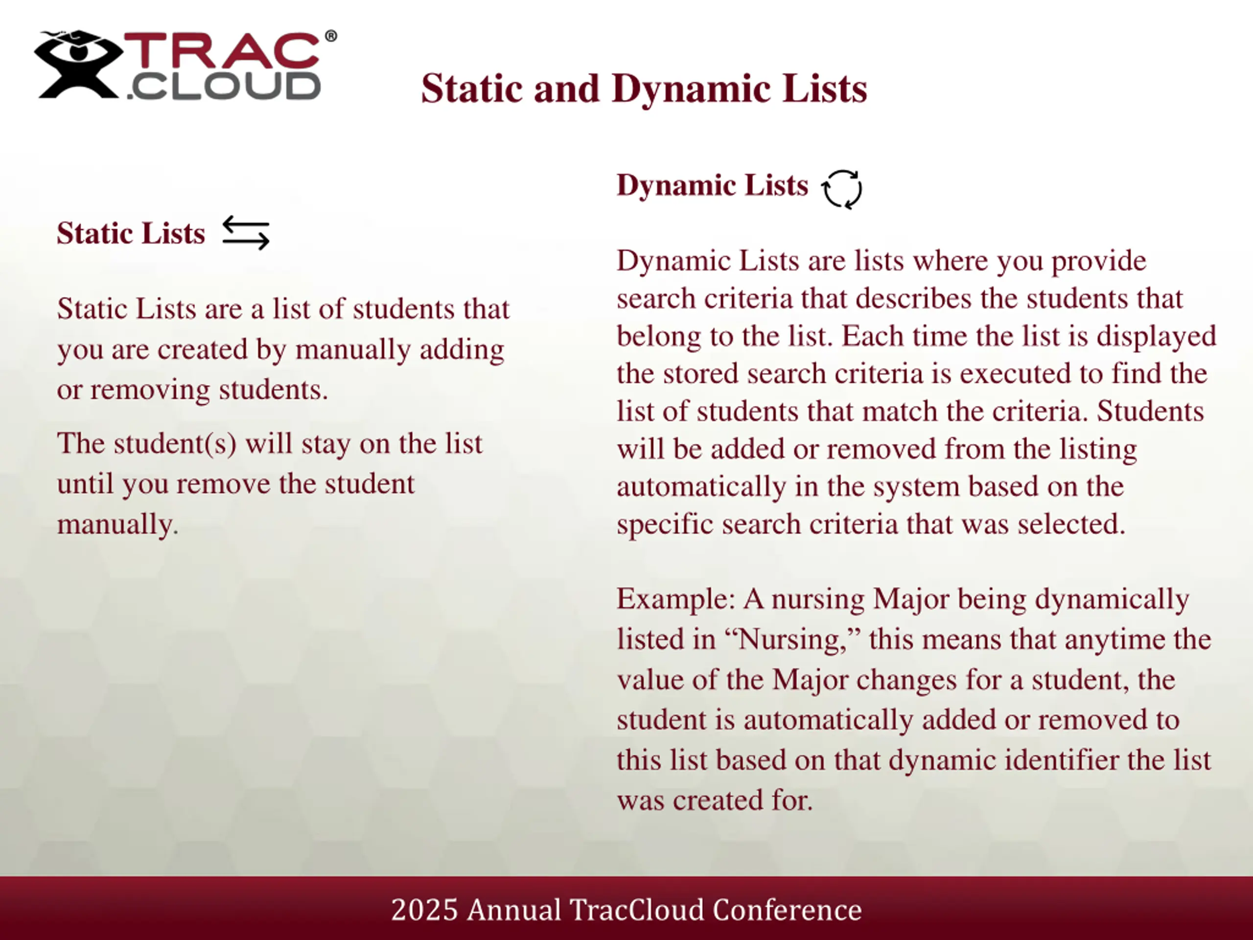 Static and Dynamic Lists Dynamic Lists Static Lists Dynamic Lists are lists where you provide search criteria that describes the students that belong to the list. Each time the list is displayed the stored search criteria is executed to find the list of students that match the criteria. Students will be added or removed from the listing automatically in the system based on the specific search criteria that was selected. Static Lists are a list of students that you are created by manually adding or removing students. The student(s) will stay on the list until you remove the student manually. Example: A nursing Major being dynamically listed in Nursing, this means that anytime the value of the Major changes for a student, the student is automatically added or removed to this list based on that dynamic identifier the list was created for. 2025 Annual TracCloud Conference 2025 Annual TracCloud Conference