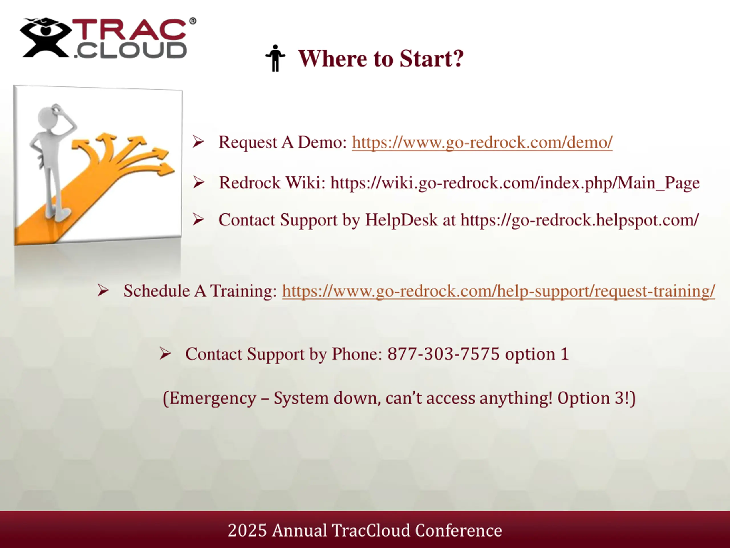 Where to Start? Request A Demo: https://www.go-redrock.com/demo/ Redrock Wiki: https://wiki.go-redrock.com/index.php/Main_Page Contact Support by HelpDesk at https://go-redrock.helpspot.com/ Schedule A Training: https://www.go-redrock.com/help-support/request-training/ Contact Support by Phone: 877-303-7575 option 1 (Emergency System down, can t access anything! Option 3!) 2025 Annual TracCloud Conference 2025 Annual TracCloud Conference
