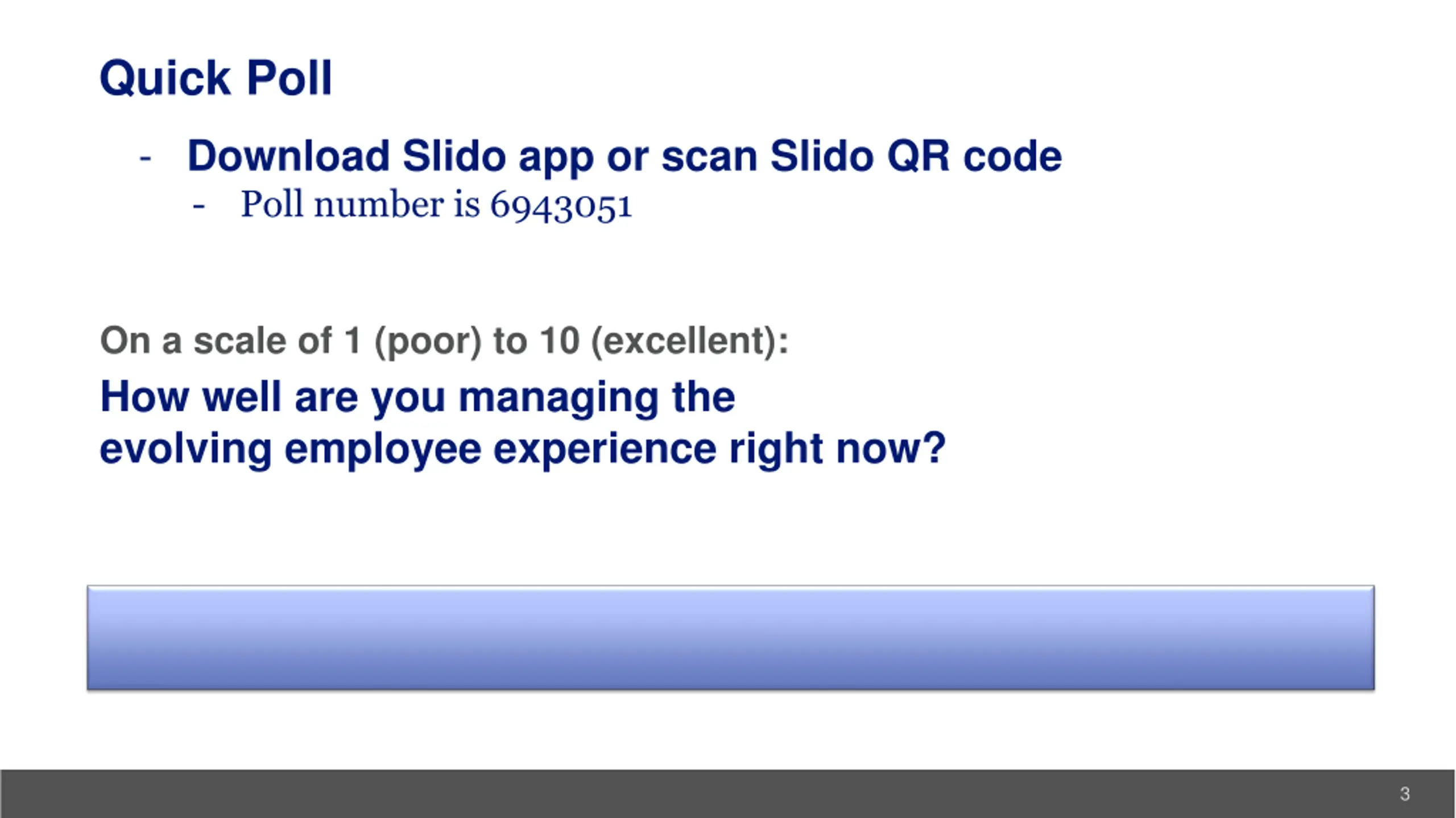 Quick Poll - Download Slido app or scan Slido QR code - Poll number is 6943051 On a scale of 1 (poor) to 10 (excellent): How well are you managing the evolving employee experience right now? 3
