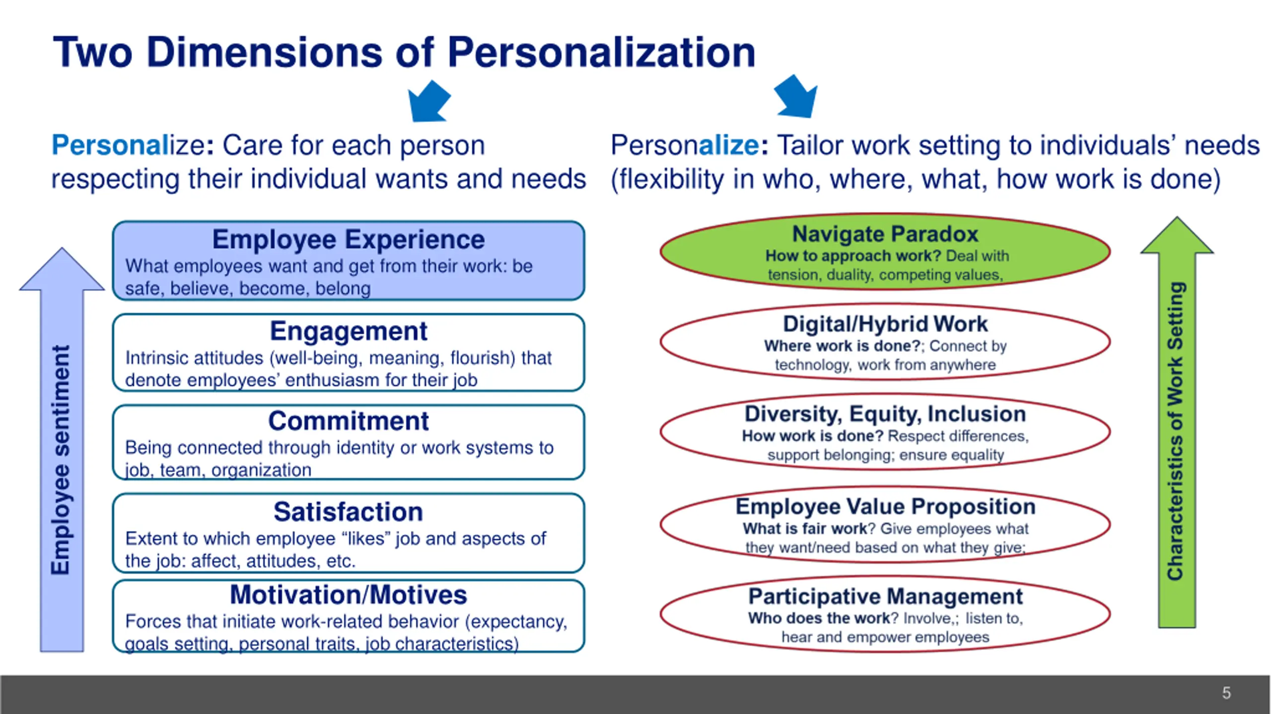 Two Dimensions of Personalization Personalize: Care for each person respecting their individual wants and needs Personalize: Tailor work setting to individuals needs (flexibility in who, where, what, how work is done) Employee Experience What employees want and get from their work: be safe, believe, become, belong Engagement Employee sentiment Intrinsic attitudes (well-being, meaning, flourish) that denote employees enthusiasm for their job Commitment Being connected through identity or work systems to job, team, organization Satisfaction Extent to which employee likes job and aspects of the job: affect, attitudes, etc. Motivation/Motives Forces that initiate work-related behavior (expectancy, goals setting, personal traits, job characteristics) 5