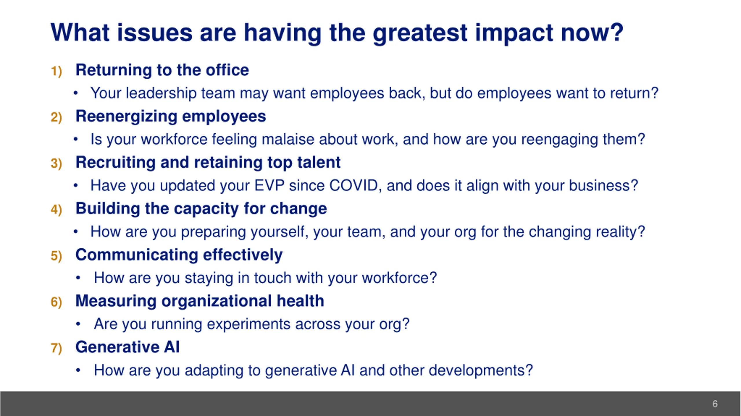 What issues are having the greatest impact now? 1) Returning to the office Your leadership team may want employees back, but do employees want to return? 2) Reenergizing employees Is your workforce feeling malaise about work, and how are you reengaging them? 3) Recruiting and retaining top talent Have you updated your EVP since COVID, and does it align with your business? 4) Building the capacity for change How are you preparing yourself, your team, and your org for the changing reality? 5) Communicating effectively How are you staying in touch with your workforce? 6) Measuring organizational health Are you running experiments across your org? 7) Generative AI How are you adapting to generative AI and other developments? 6