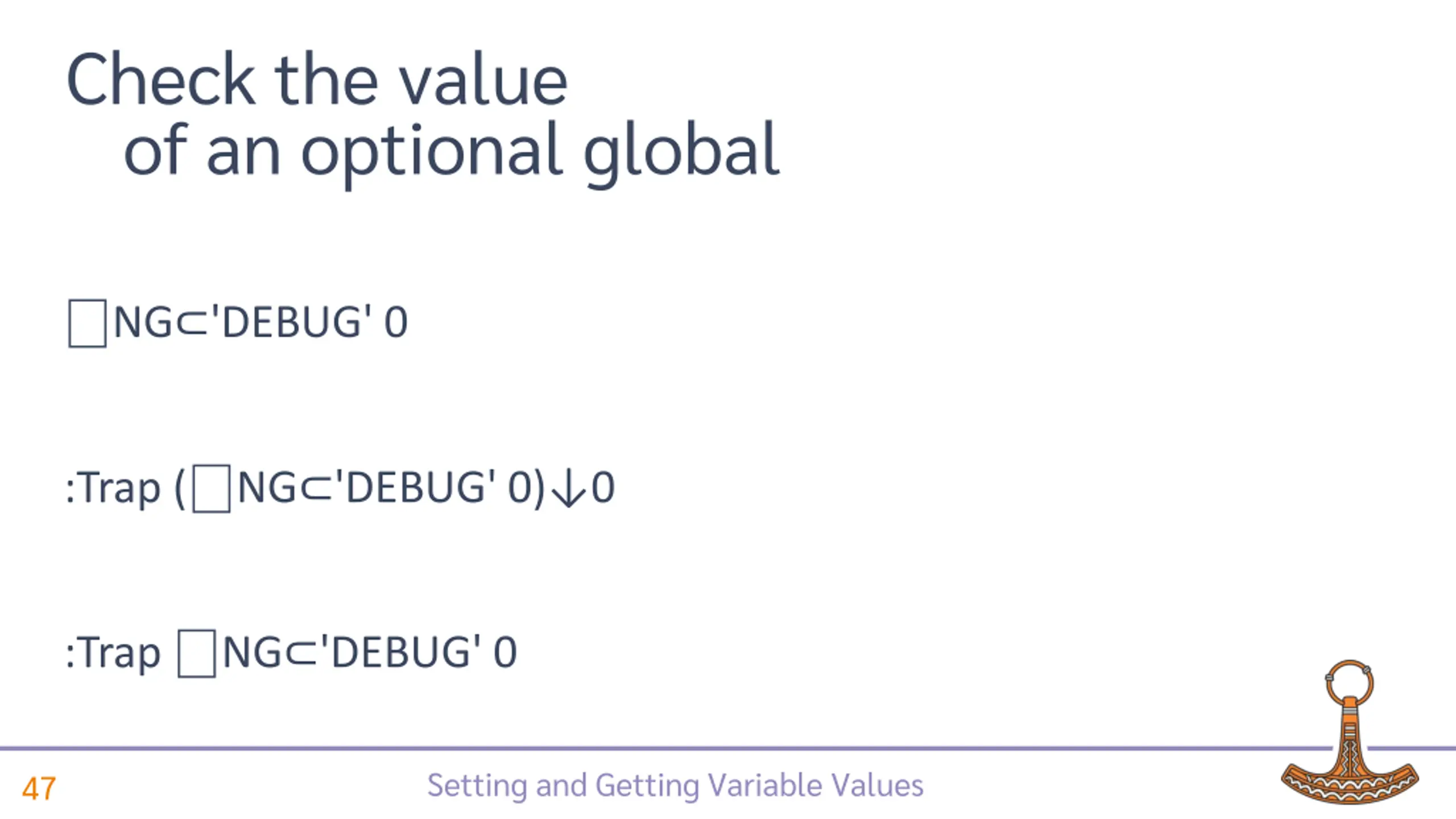 Check the value of an optional global NG 'DEBUG' 0 :Trap ( NG 'DEBUG' 0) 0 :Trap NG 'DEBUG' 0 Setting and Getting Variable Values 47