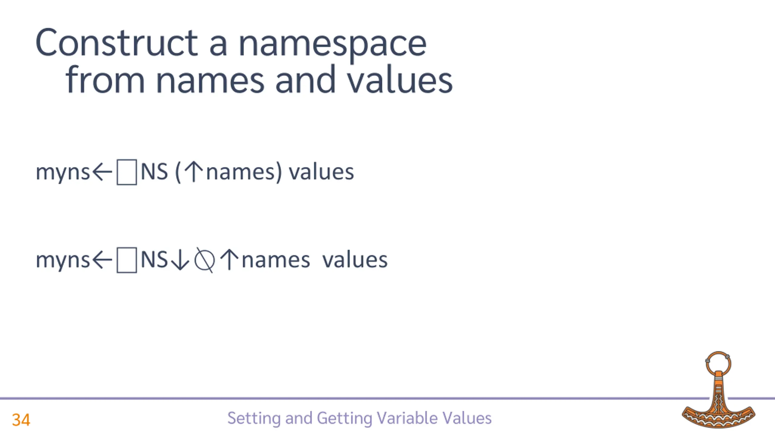 Construct a namespace from names and values myns NS ( names) values myns NS names values Setting and Getting Variable Values 34