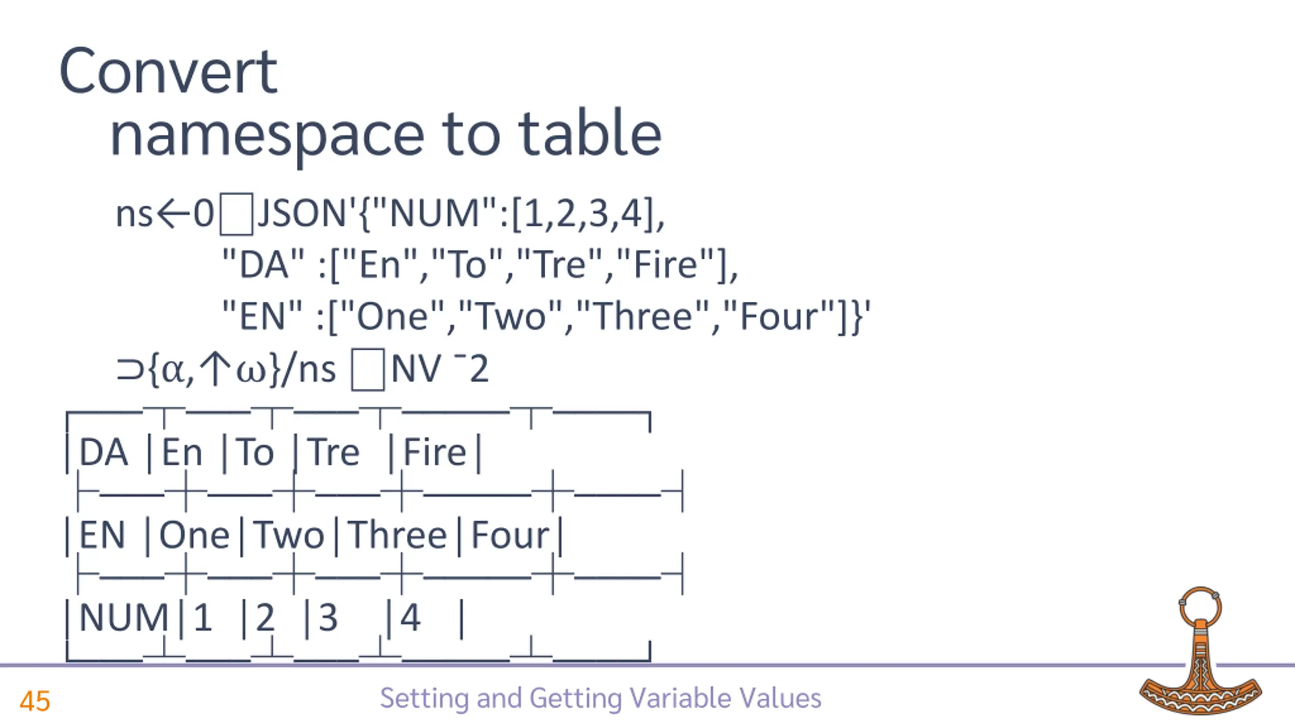 Convert namespace to table ns 0 JSON'{"NUM":[1,2,3,4], "DA" :["En","To","Tre","Fire"], "EN" :["One","Two","Three","Four"]}' { }/ns NV 2 DA EN NUM 1 2 3 4 En To Tre Fire One Two Three Four Setting and Getting Variable Values 44