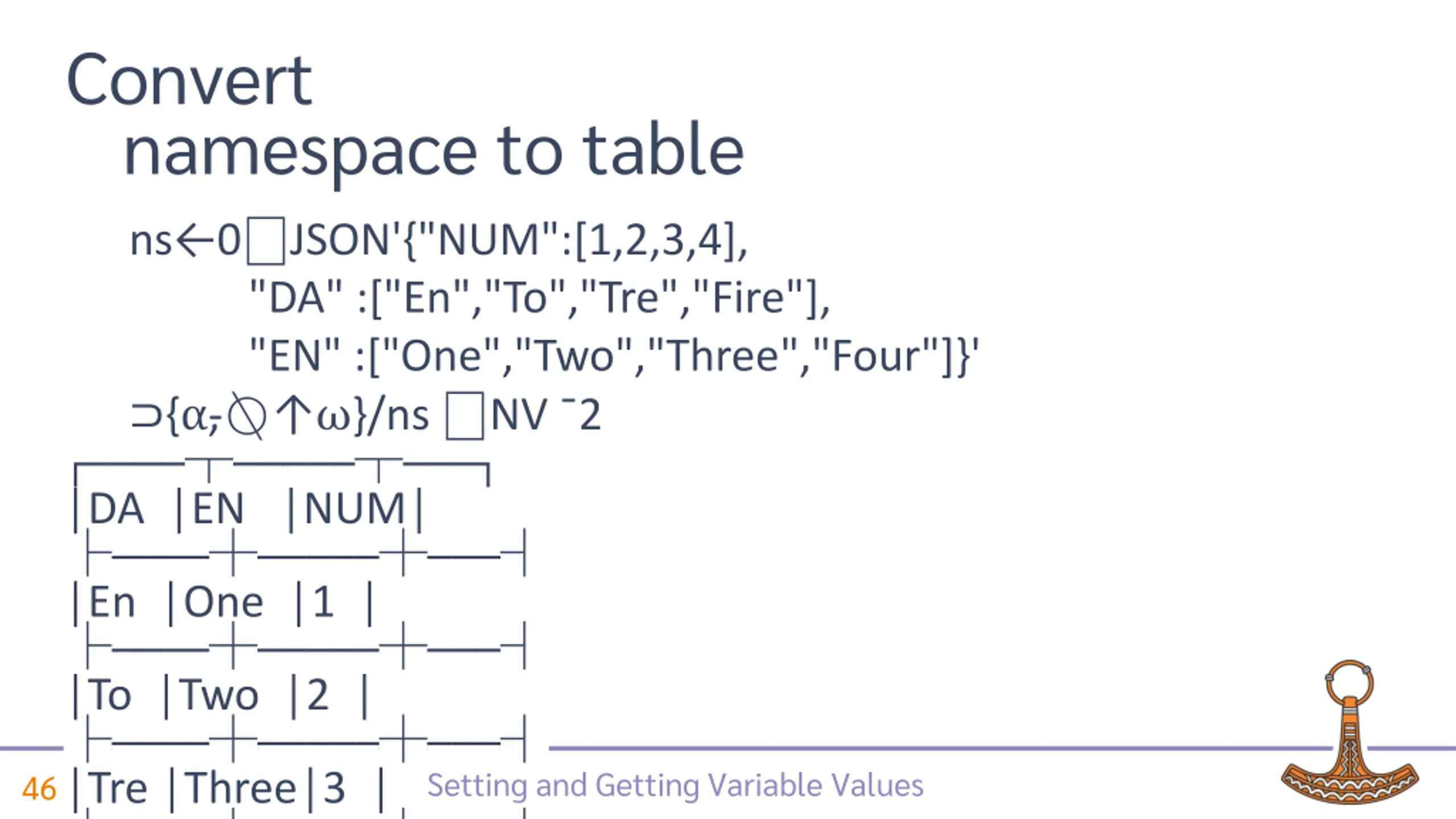 Convert namespace to table ns 0 JSON'{"NUM":[1,2,3,4], "DA" :["En","To","Tre","Fire"], "EN" :["One","Two","Three","Four"]}' { , }/ns NV 2 DA En To Tre Fire EN One Two Three Four NUM 1 2 3 4 Setting and Getting Variable Values 45