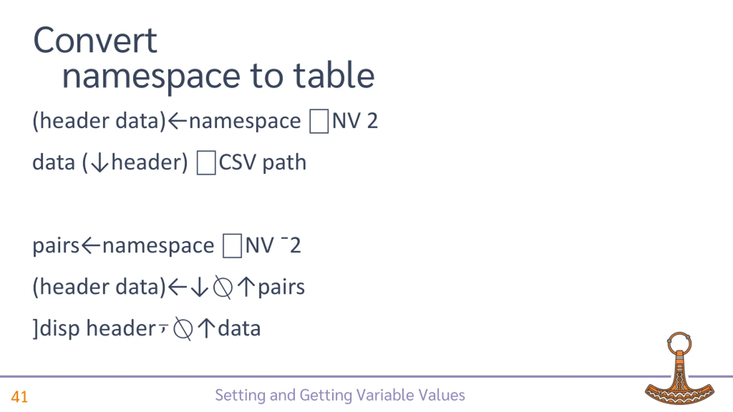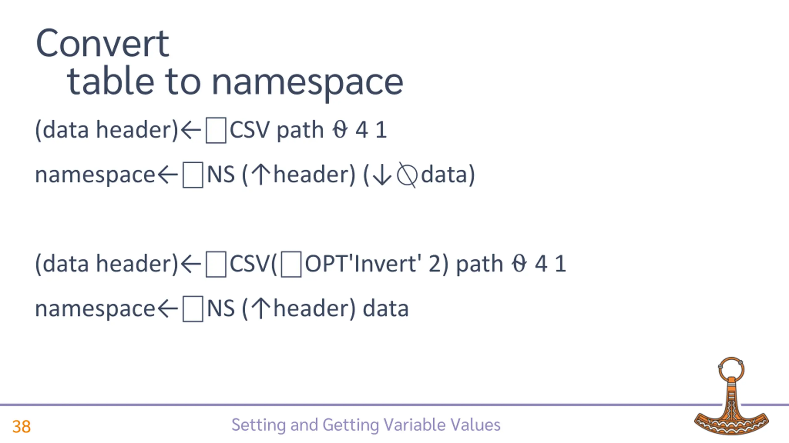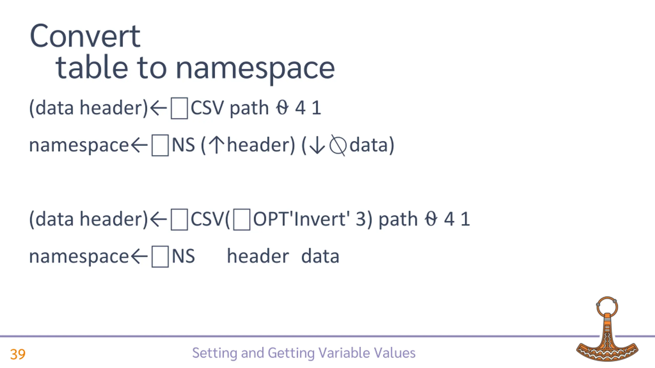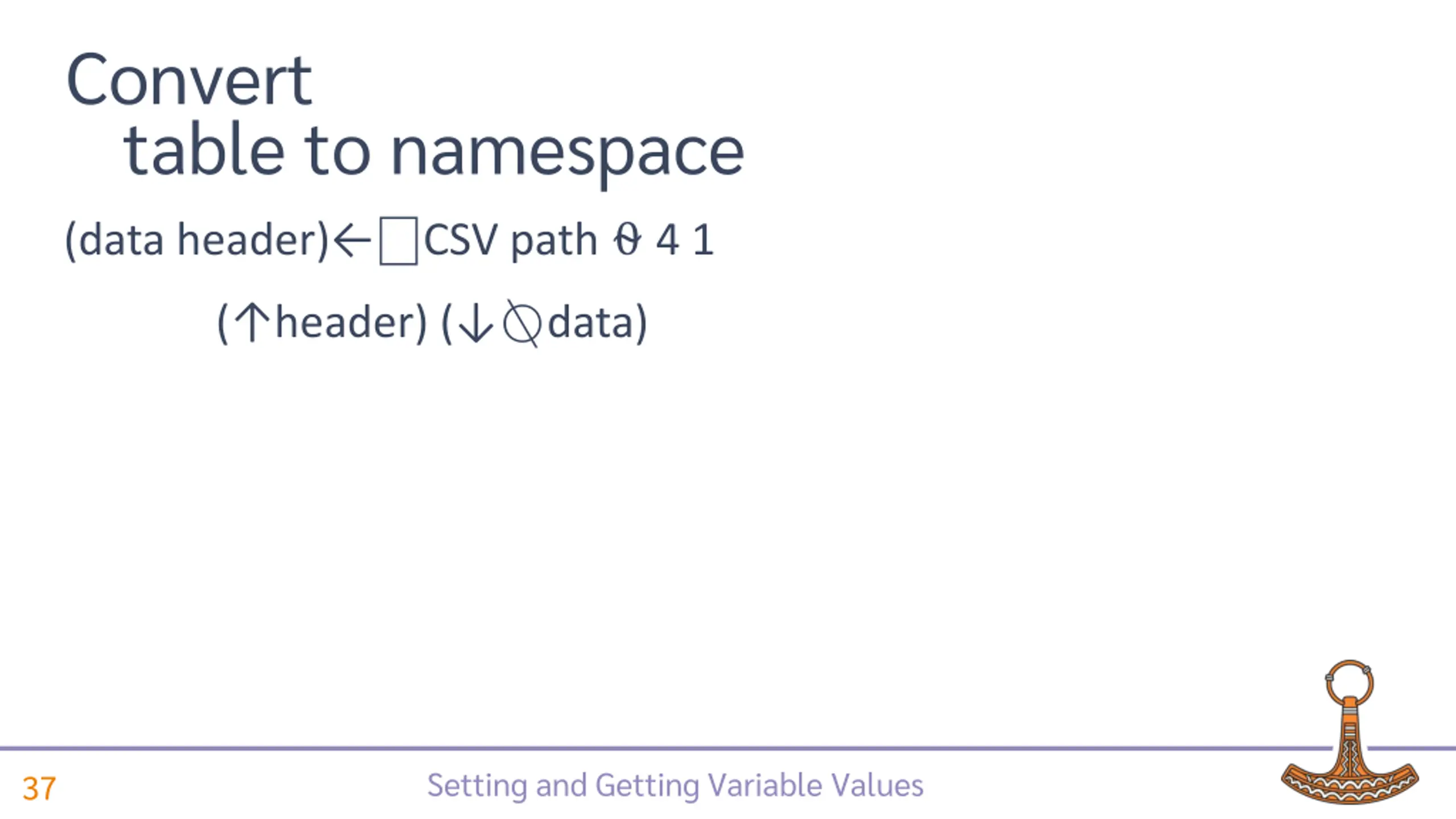Convert table to namespace (data header) CSV path 4 1 ( header) ( data) Setting and Getting Variable Values 37