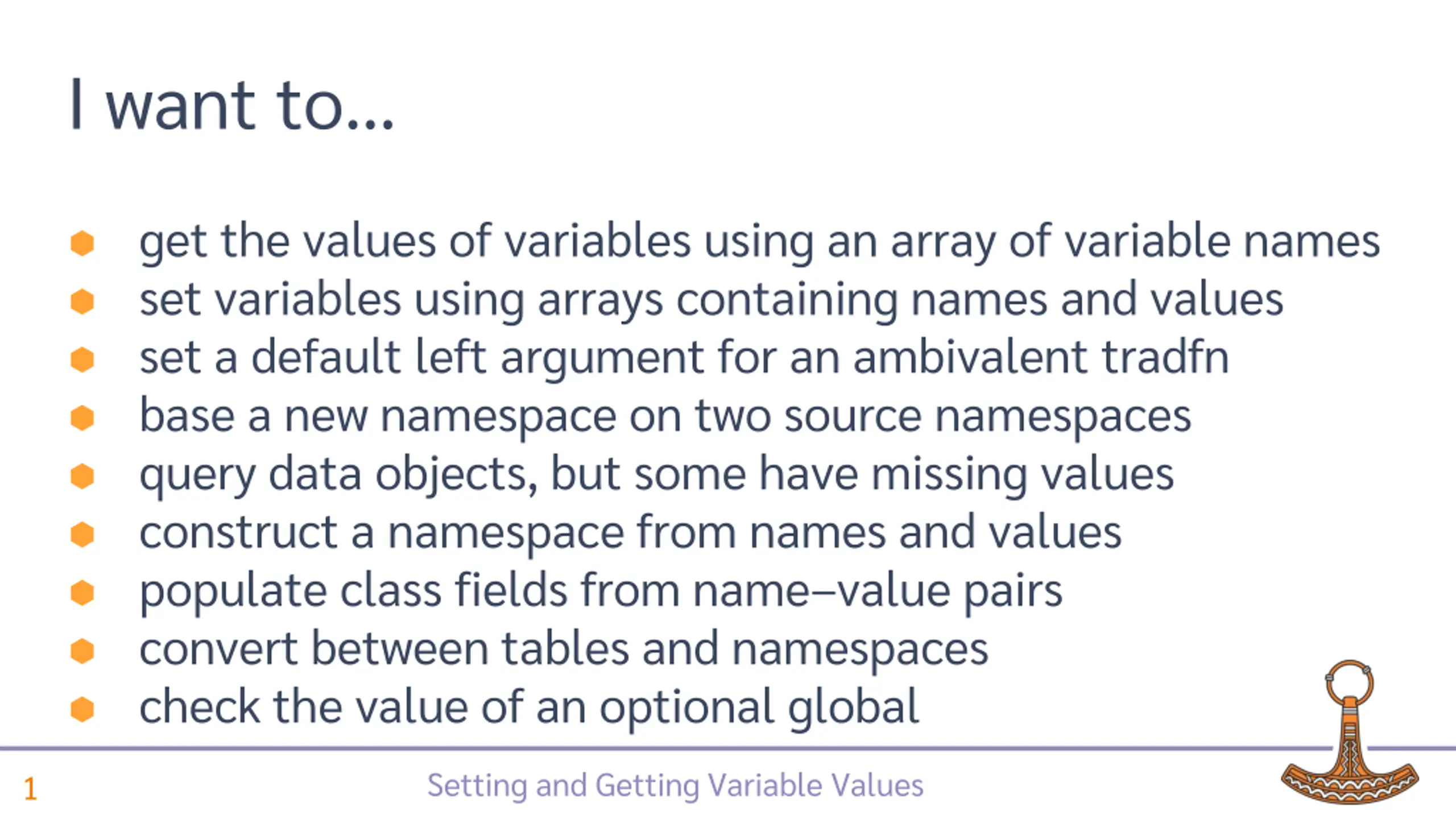 Explore the process of setting and getting variable values, handling multiple variables, working with namespaces, and optimizing performance in Elsinore 2023. Learn about pitfalls, best practices, and strategies for efficient variable management.