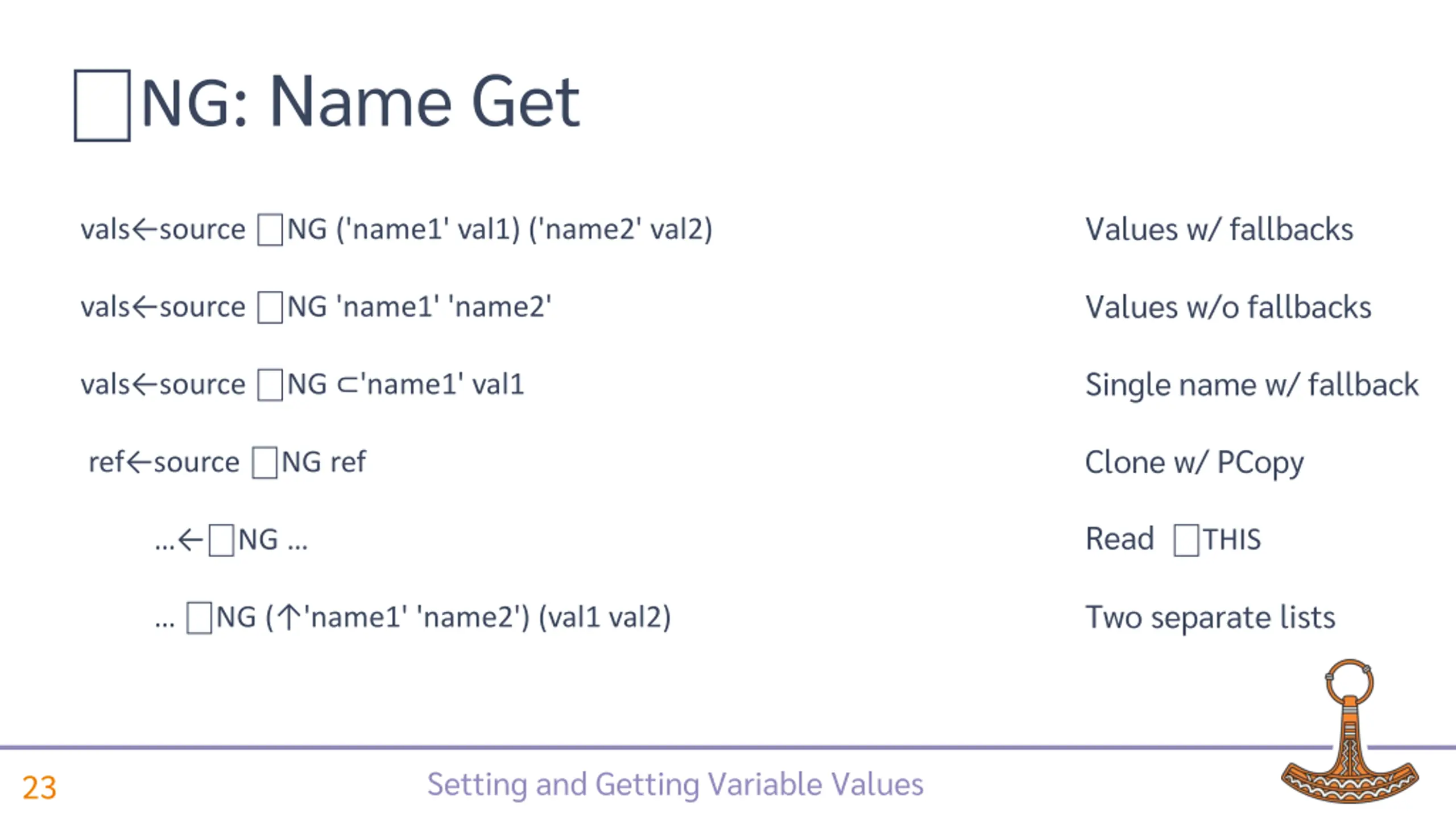 NS: Name Set Add vars with values ref target NS ('name1' val1) ('name2' val2) Pick values from there ref target source. NS 'name1' 'name2' Set single variable ref target NS 'name1' 'val1' Copy vars from ref ref target NS ref New namespace ref NS Two separate lists NS ( 'name1' 'name2') (val1 val2) Setting and Getting Variable Values 22