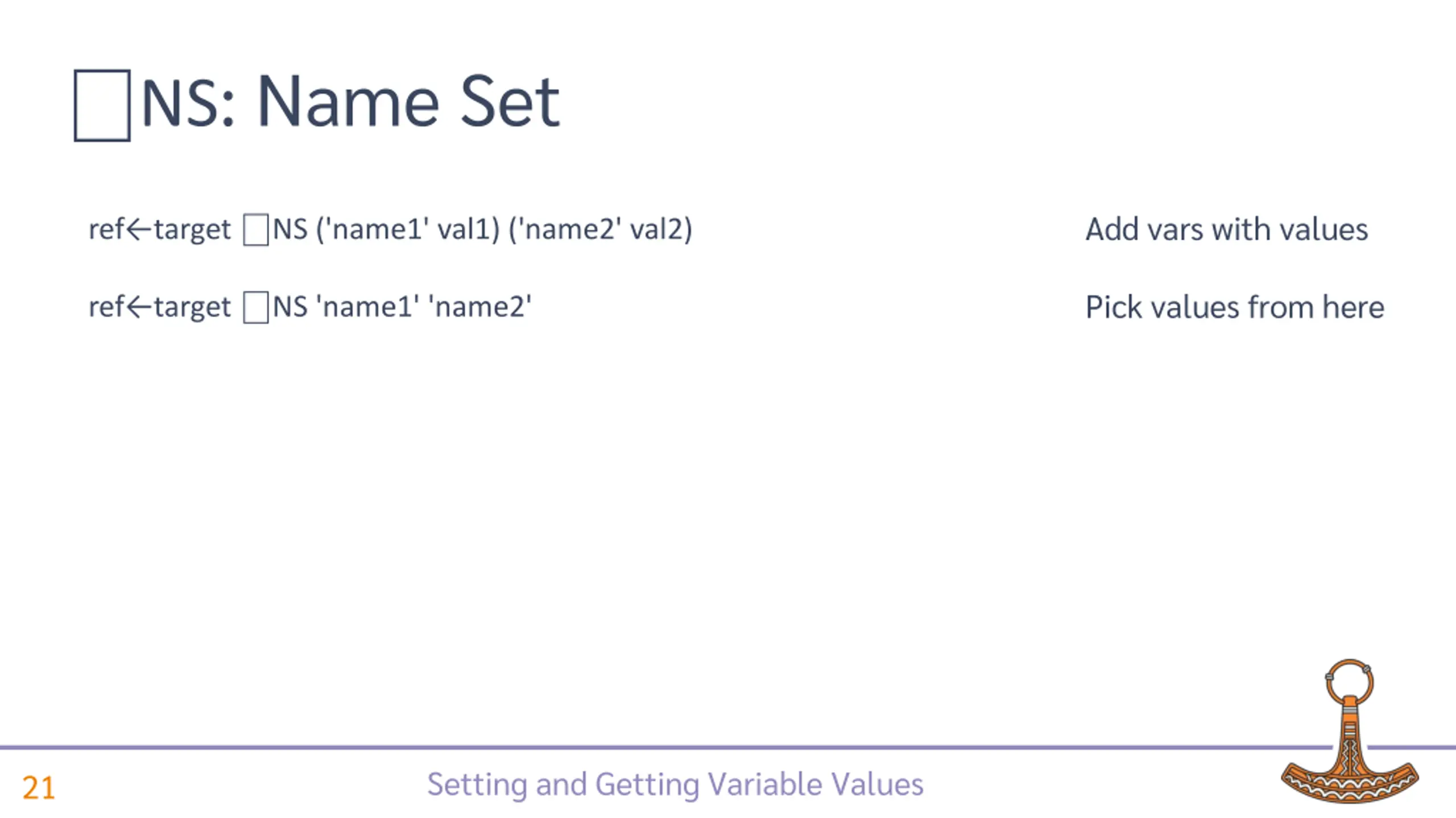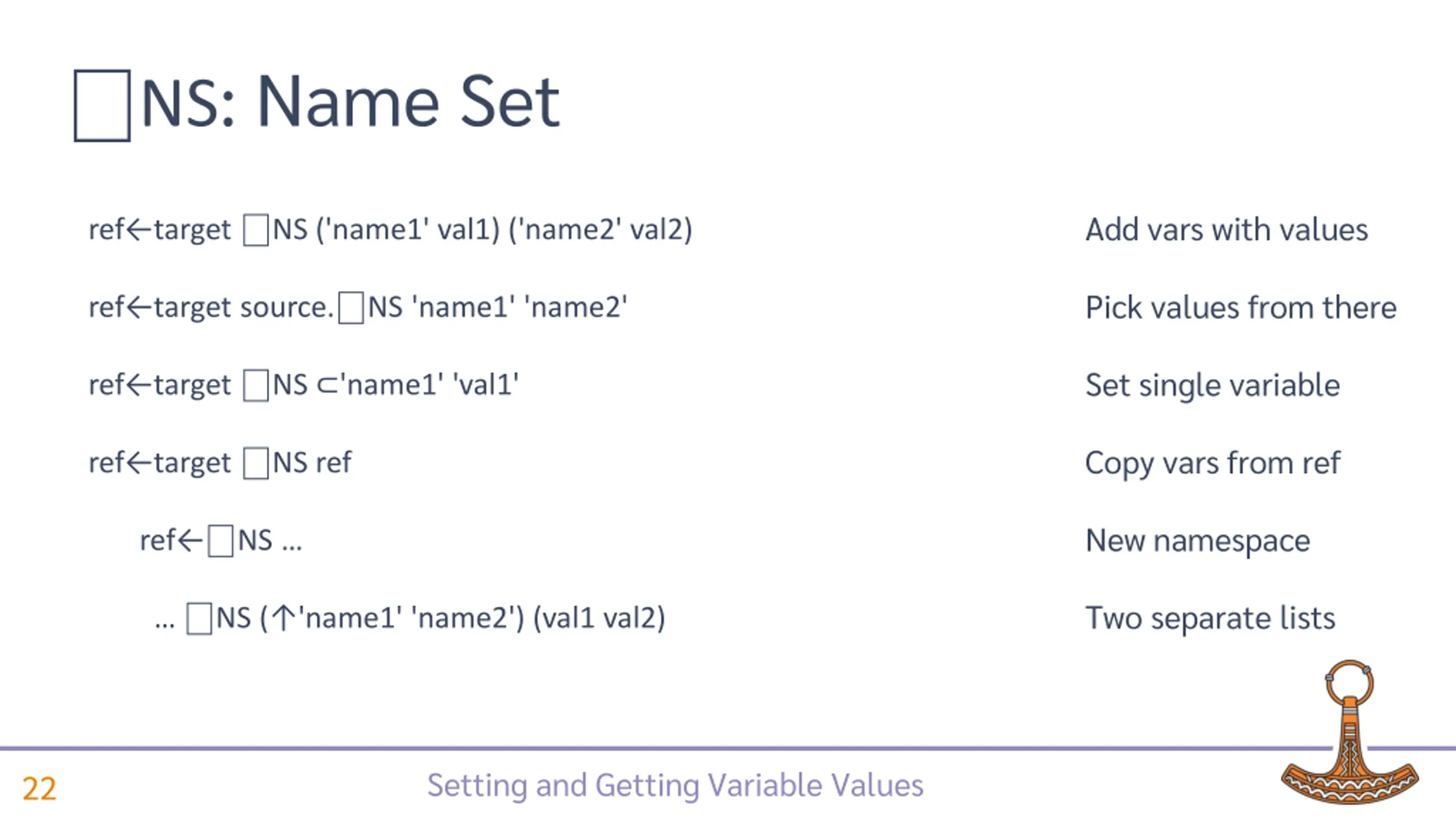 NS: Name Set Add vars with values ref target NS ('name1' val1) ('name2' val2) Pick values from here ref target NS 'name1' 'name2' Setting and Getting Variable Values 21