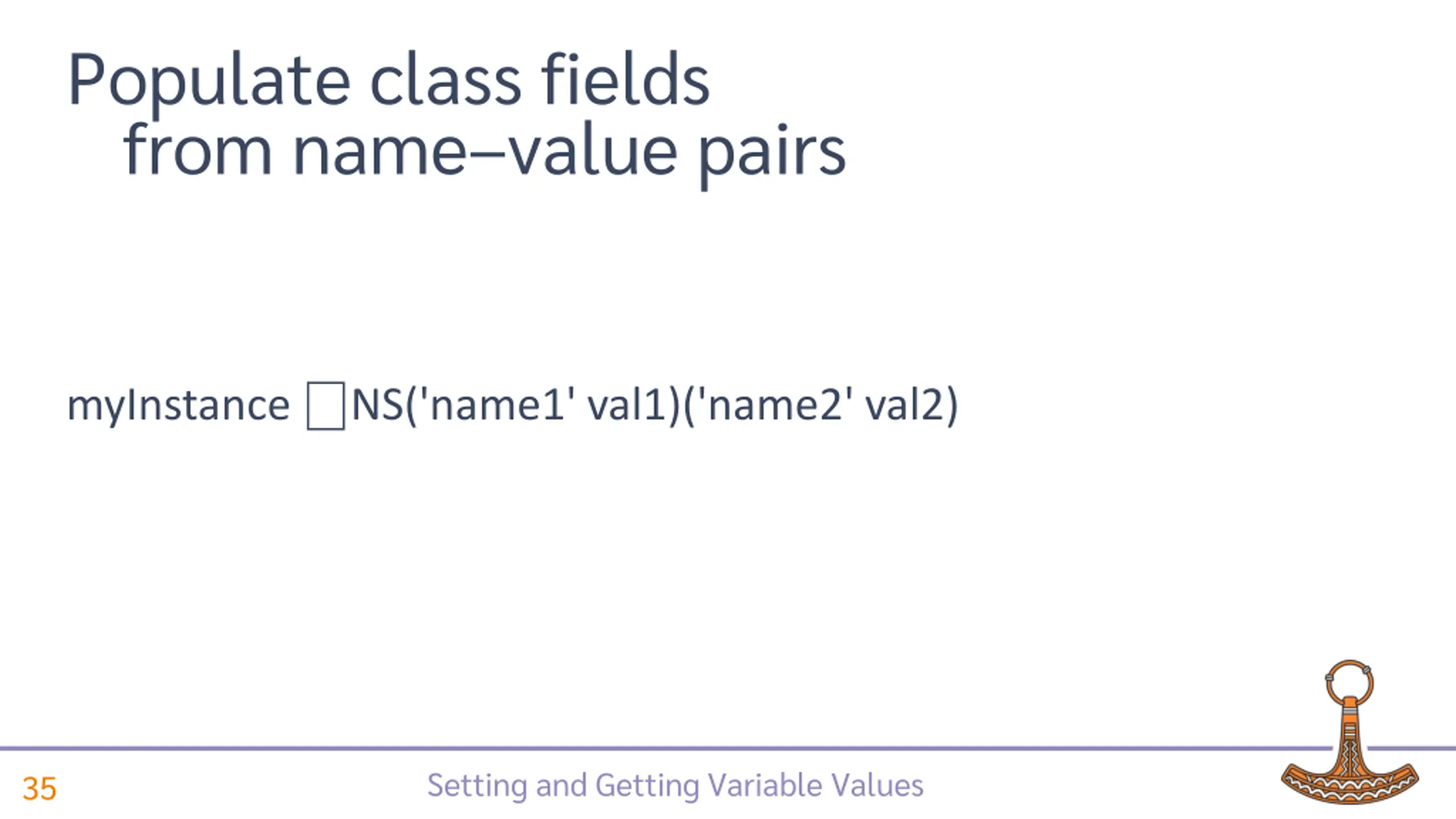 Populate class fields from name value pairs myInstance NS('name1' val1)('name2' val2) Setting and Getting Variable Values 35