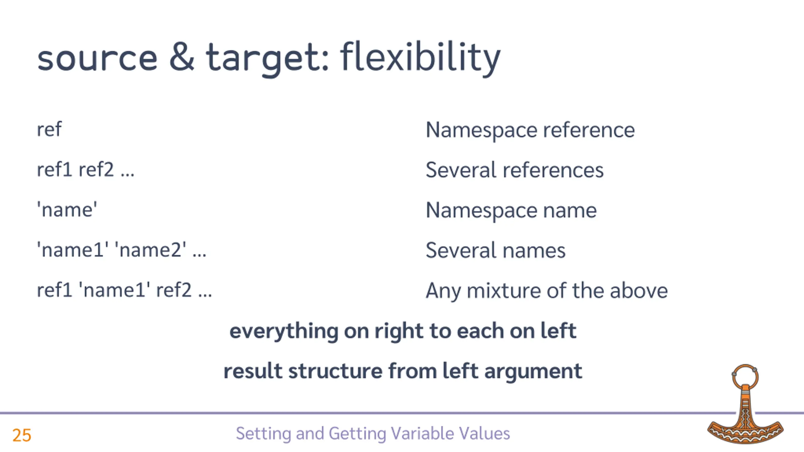 source & target: flexibility Namespace reference Several references Namespace name Several names Any mixture of the above ref ref1 ref2 'name' 'name1' 'name2' ref1 'name1' ref2 everything on right to each on left result structure from left argument Setting and Getting Variable Values 25