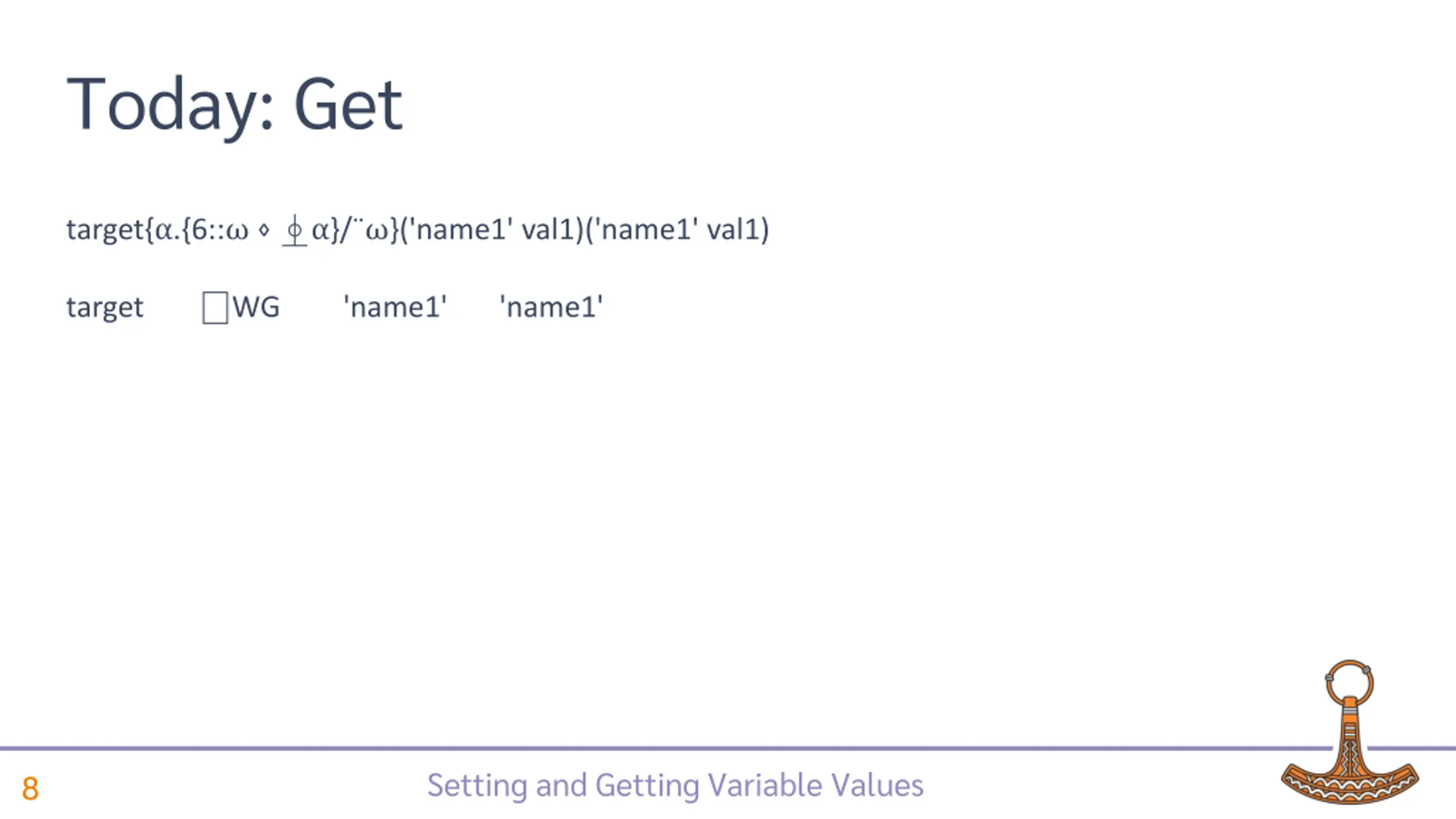 Today: Get target{ .{6:: }/ }('name1' val1)('name1' val1) target WG 'name1' 'name1' Setting and Getting Variable Values 8