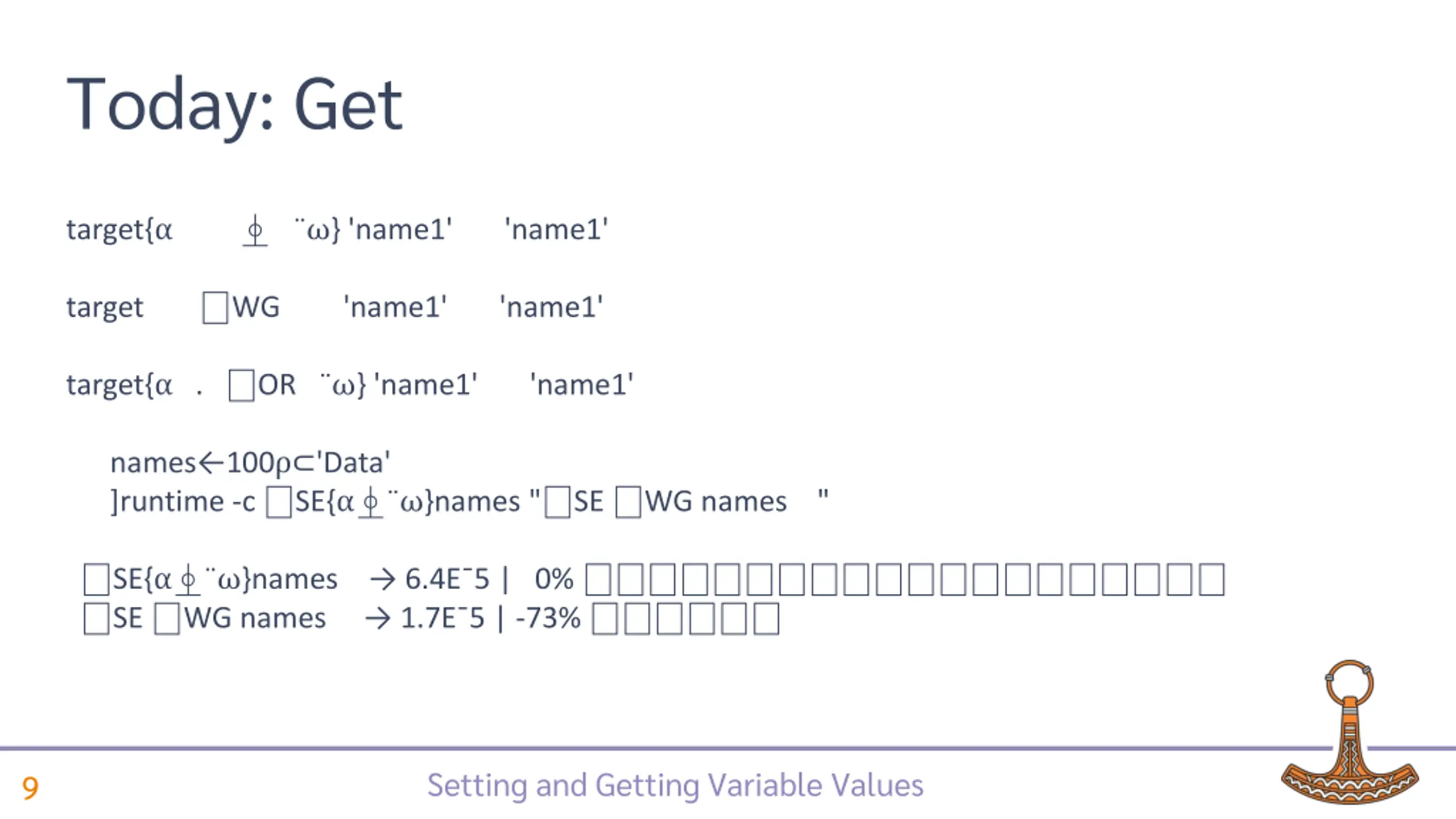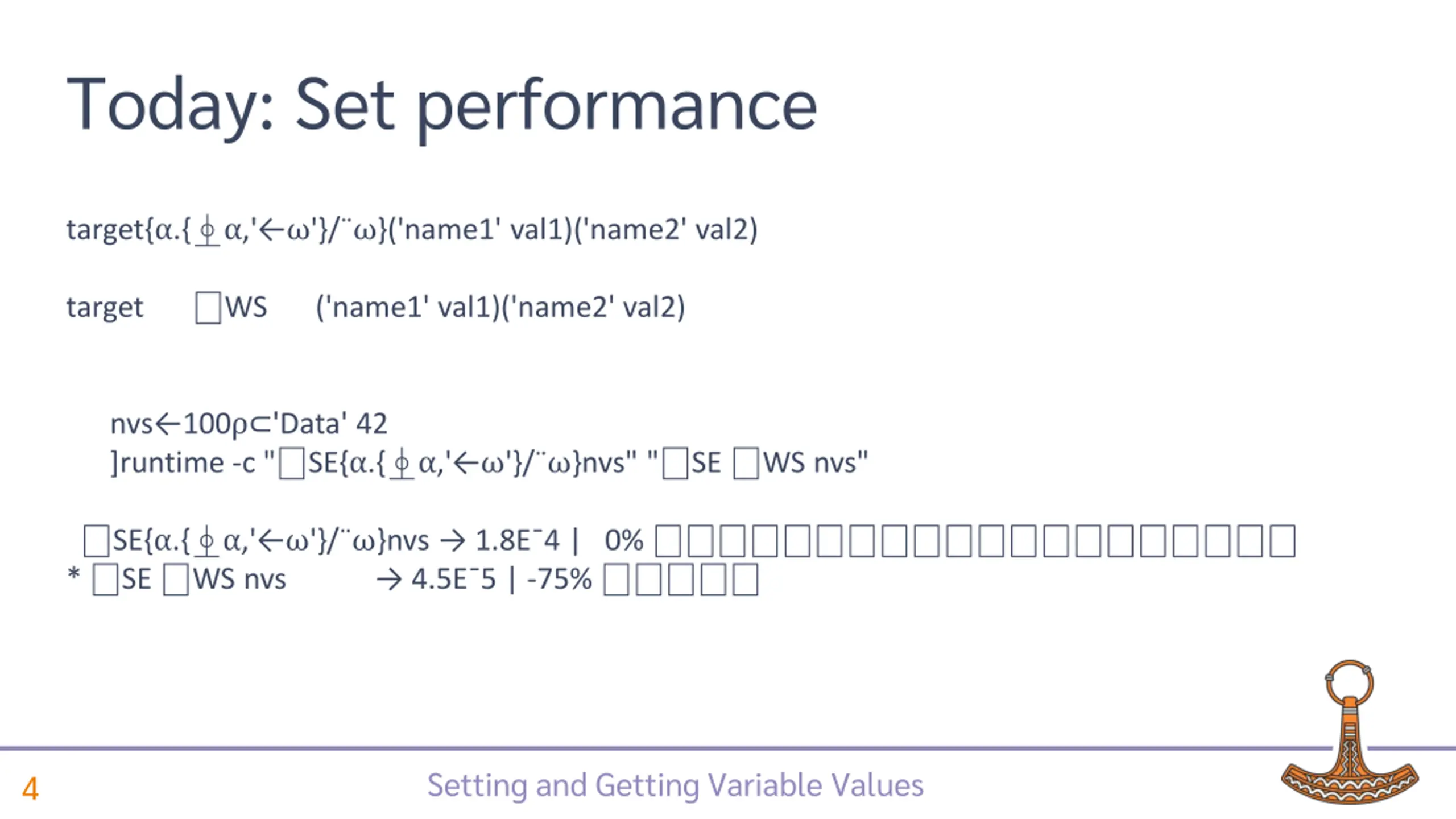 Today: Set performance target{ .{ ,' '}/ }('name1' val1)('name2' val2) target WS ('name1' val1)('name2' val2) nvs 100 'Data' 42 ]runtime -c " SE{ .{ ,' '}/ }nvs" " SE WS nvs" SE{ .{ ,' '}/ }nvs 1.8E 4 | 0% * SE WS nvs 4.5E 5 | -75% Setting and Getting Variable Values 4