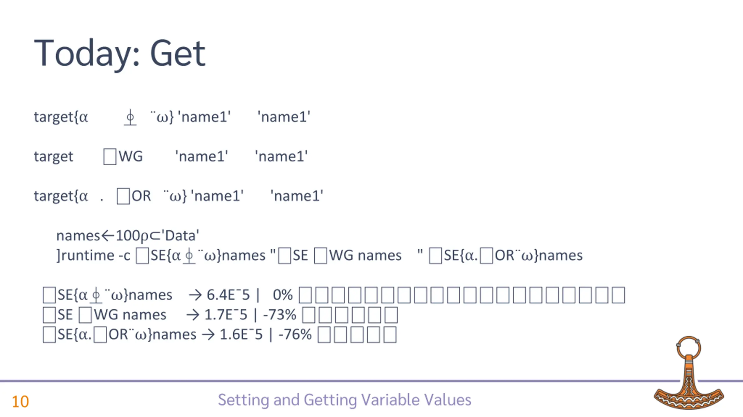 Today: Get target{ } 'name1' 'name1' target WG 'name1' 'name1' target{ . OR } 'name1' 'name1' names 100 'Data' ]runtime -c SE{ }names " SE WG names " SE{ . OR }names SE{ }names 6.4E 5 | 0% SE WG names 1.7E 5 | -73% SE{ . OR }names 1.6E 5 | -76% Setting and Getting Variable Values 10