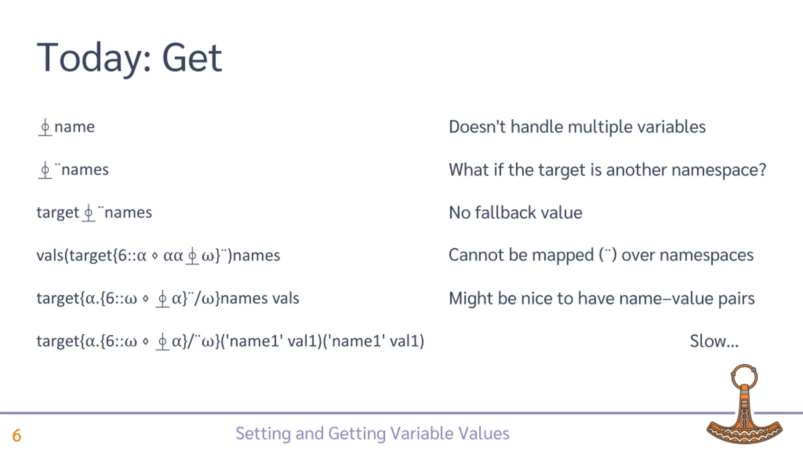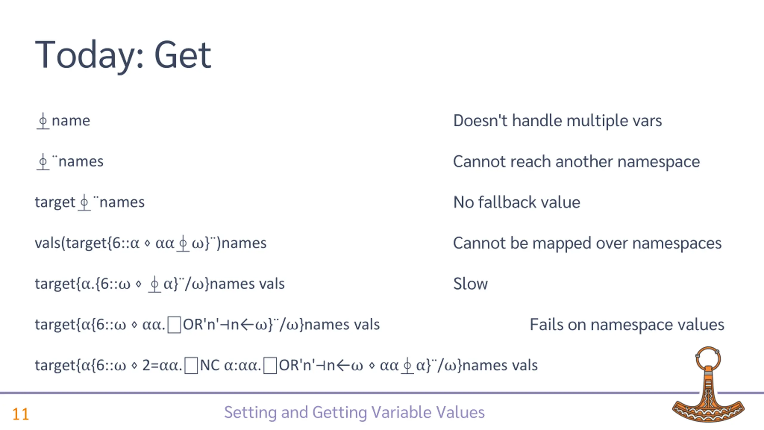 Today: Get Doesn't handle multiple vars name Cannot reach another namespace names No fallback value target names Cannot be mapped over namespaces vals(target{6:: } )names Slow target{ .{6:: } / }names vals Fails on namespace values target{ {6:: . OR'n' n } / }names vals target{ {6:: 2= . NC : . OR'n' n } / }names vals Setting and Getting Variable Values 11