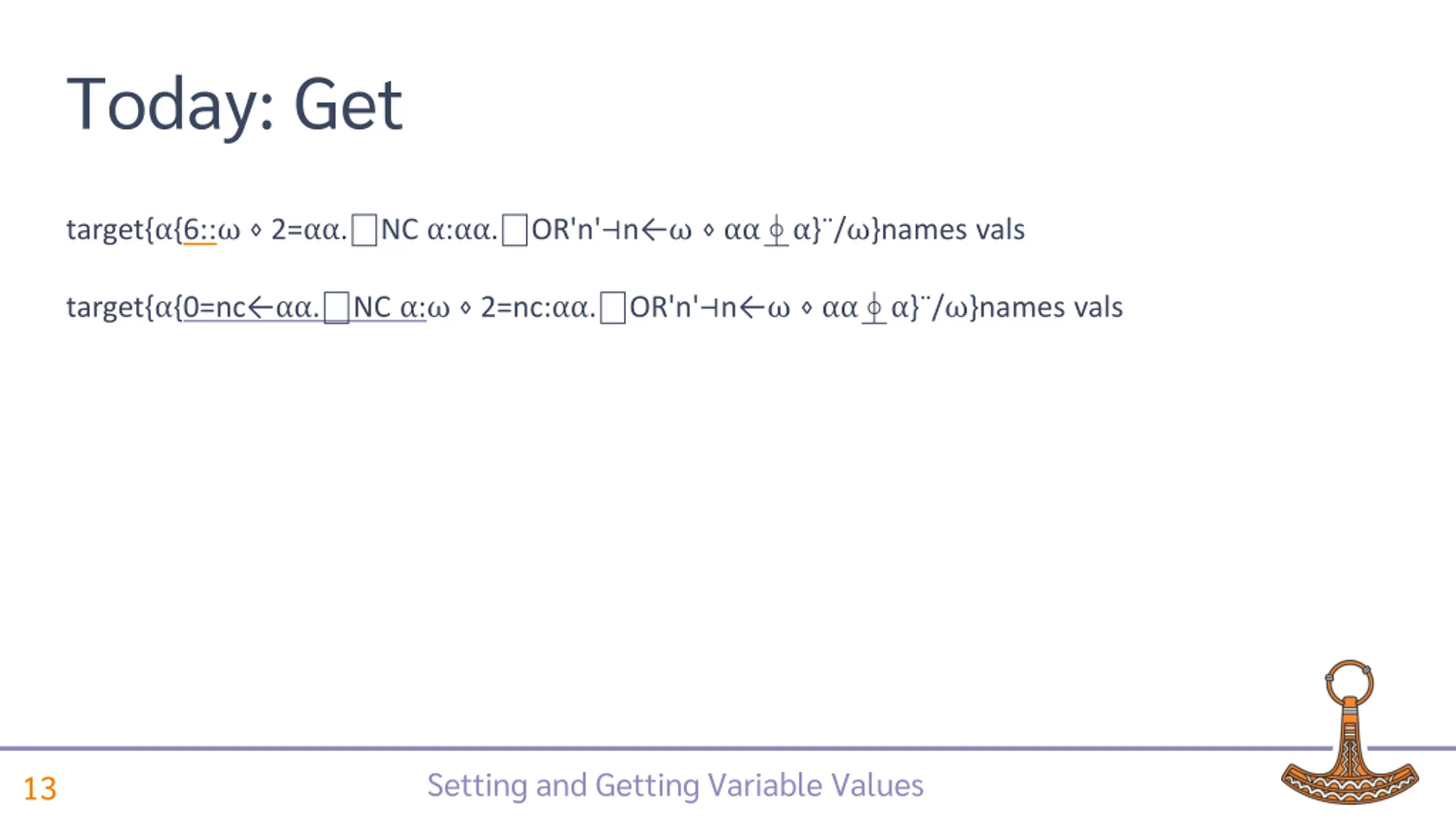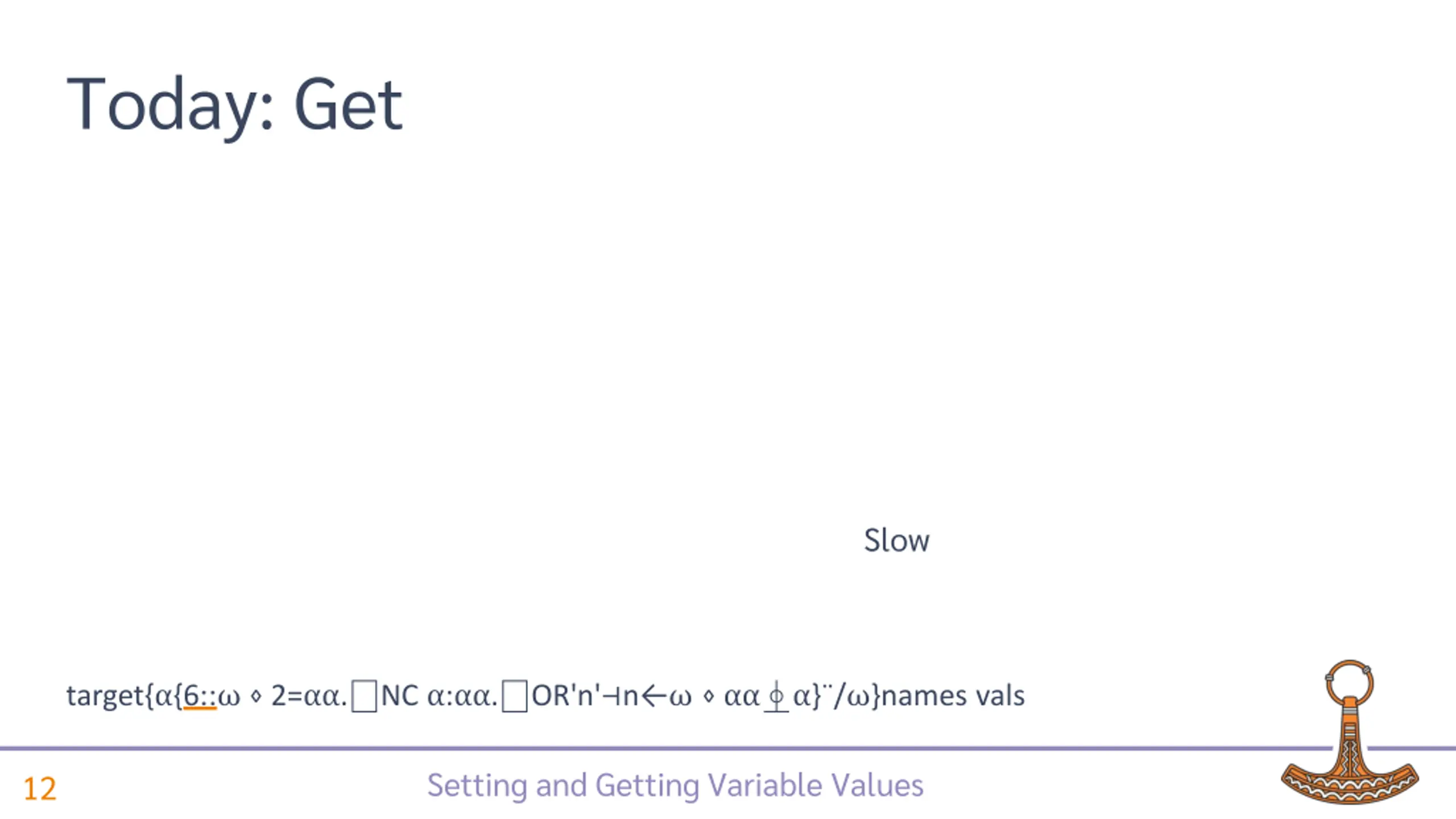 Today: Get Slow target{ {6:: 2= . NC : . OR'n' n } / }names vals Setting and Getting Variable Values 12