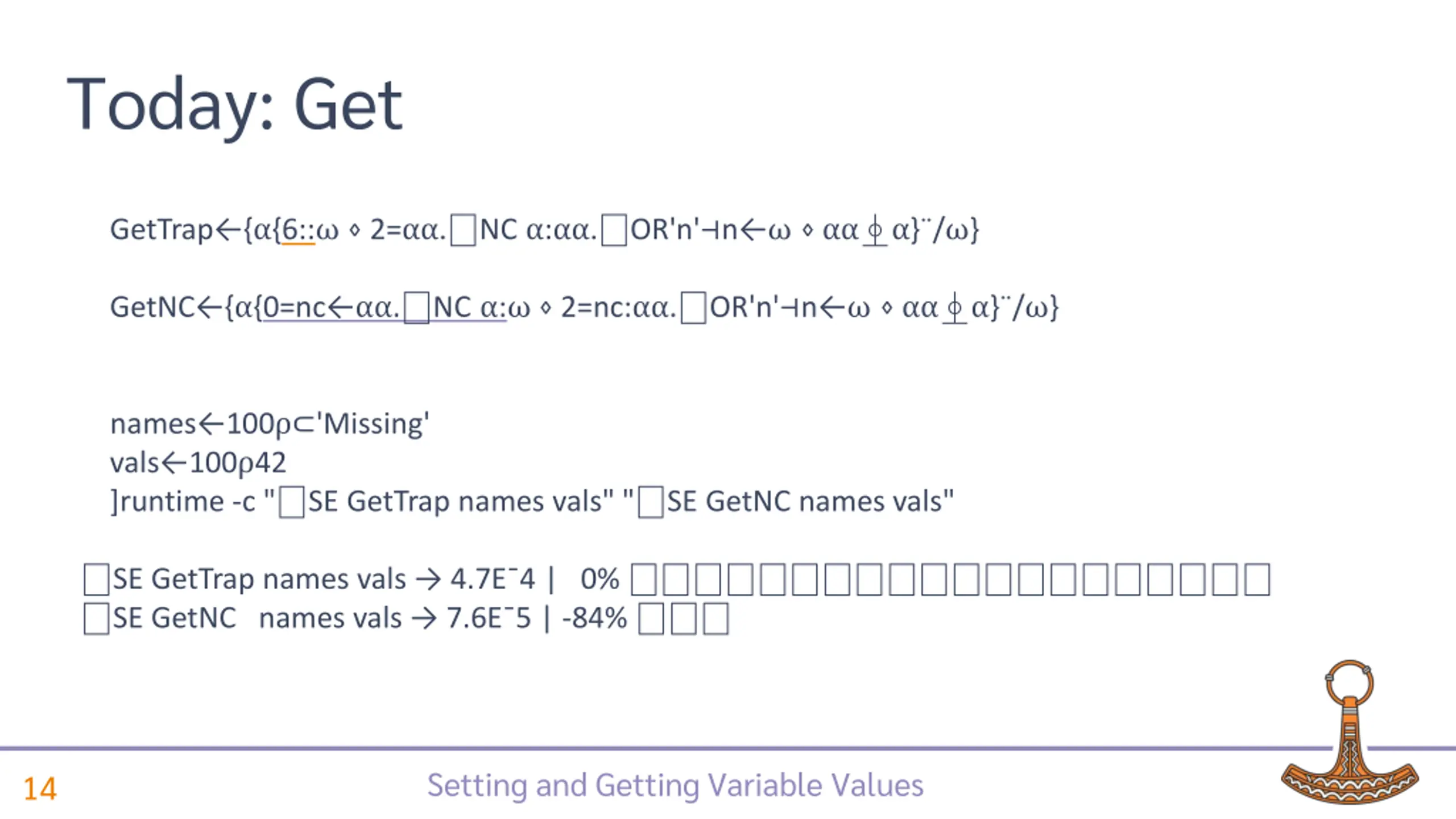 Today: Get GetTrap { {6:: 2= . NC : . OR'n' n } / } GetNC {_ {0=nc . NC : 2=nc: . OR'n' n } / } names 100 'Missing' vals 100 42 ]runtime -c " SE GetTrap names vals" " SE GetNC names vals" SE GetTrap names vals 4.7E 4 | 0% SE GetNC names vals 7.6E 5 | -84% Setting and Getting Variable Values 14