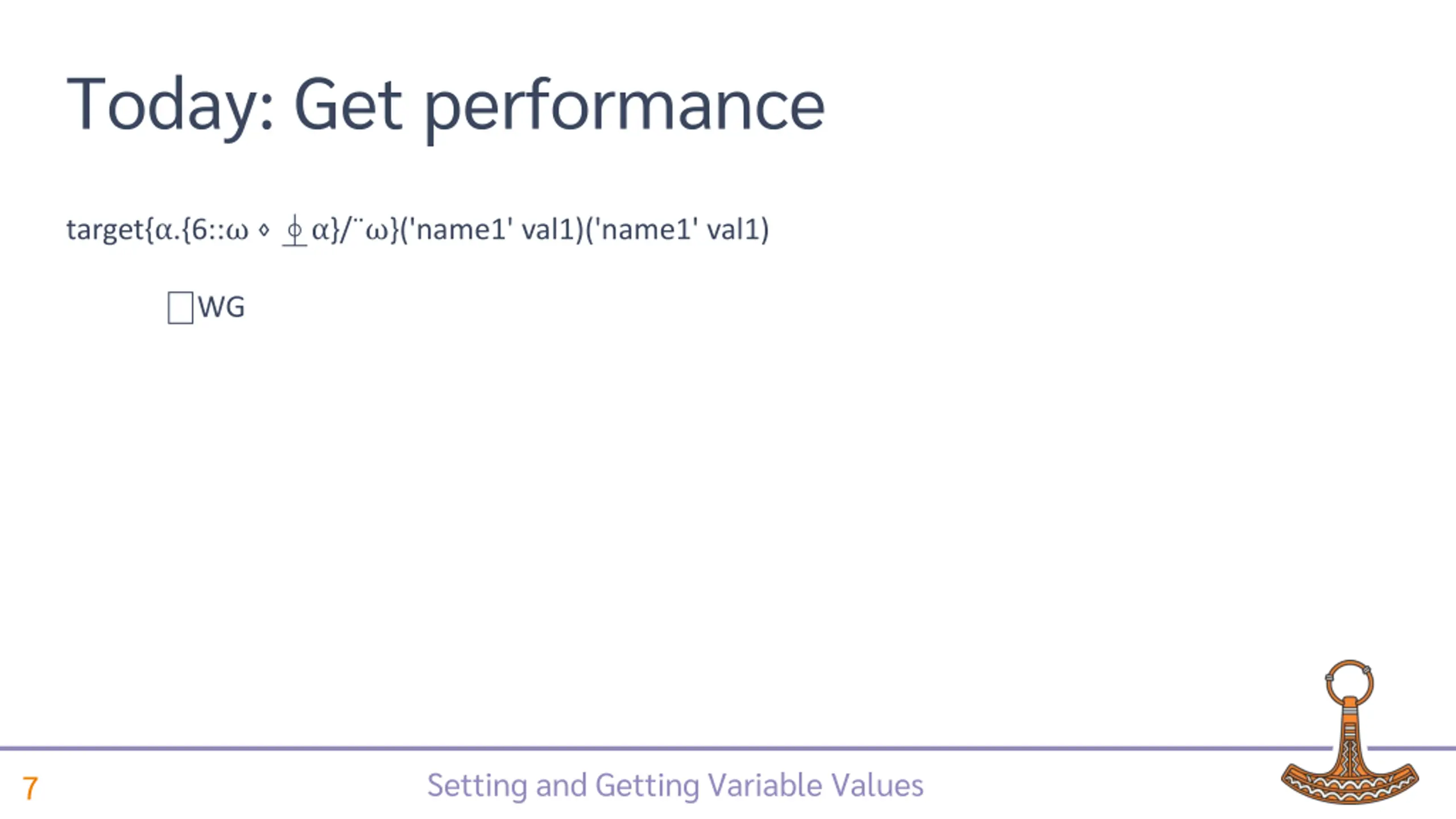 Today: Get performance target{ .{6:: }/ }('name1' val1)('name1' val1) WG Setting and Getting Variable Values 7