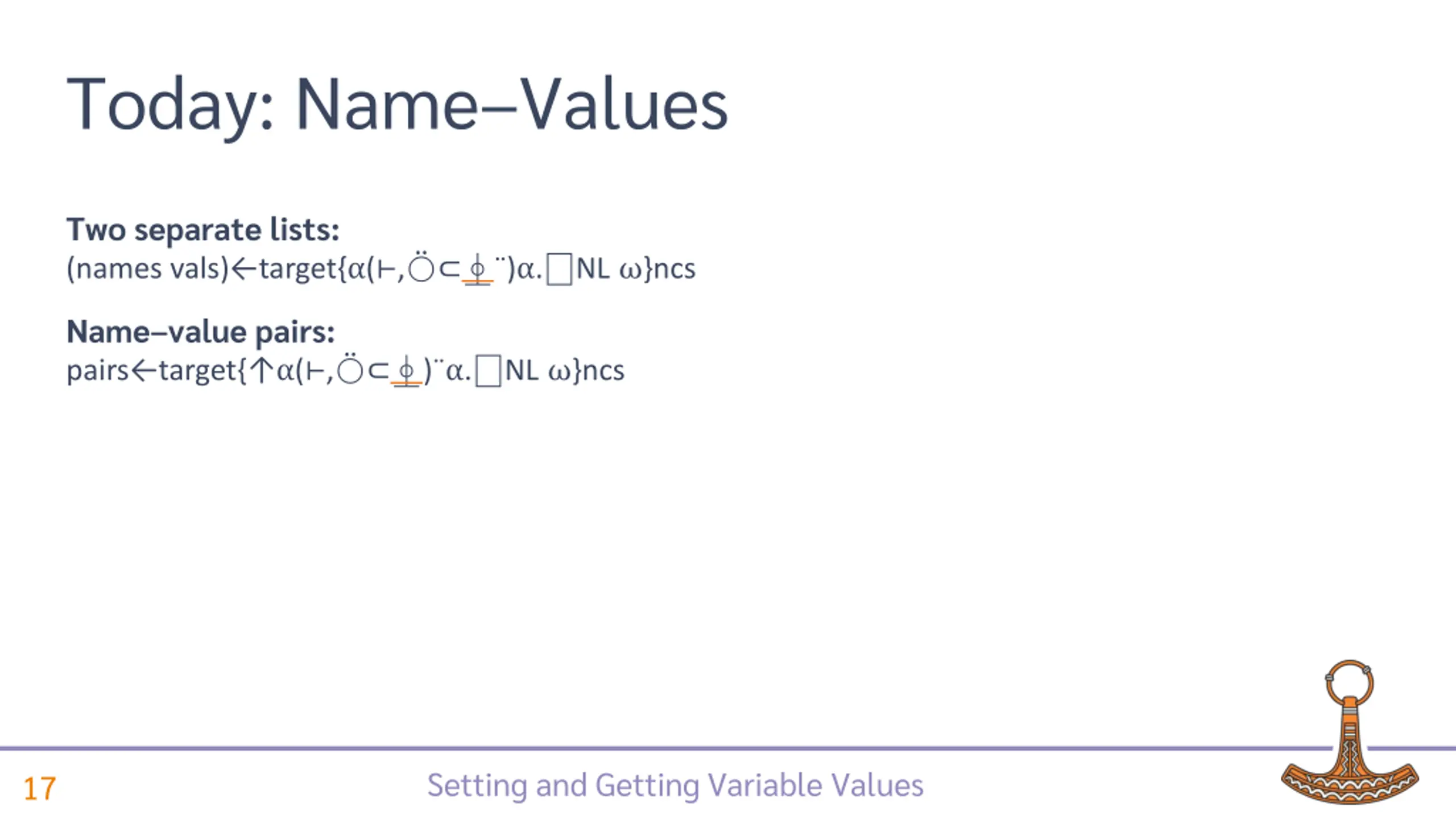 Today: NameValues Two separate lists: (names vals) target{ ( , ) . NL }ncs Name value pairs: pairs target{ ( , ) . NL }ncs Setting and Getting Variable Values 16