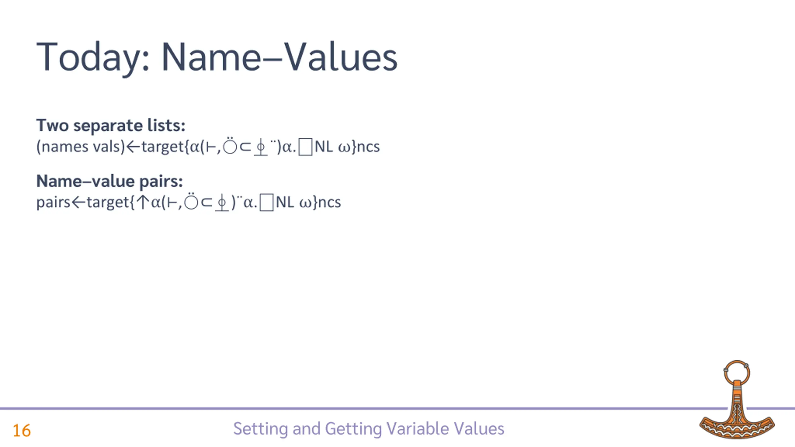 Today: NameValues Two separate lists: (names vals) target{ ( , ) . NL }ncs Name value pairs: pairs target{ ( , ) . NL }ncs Setting and Getting Variable Values 17