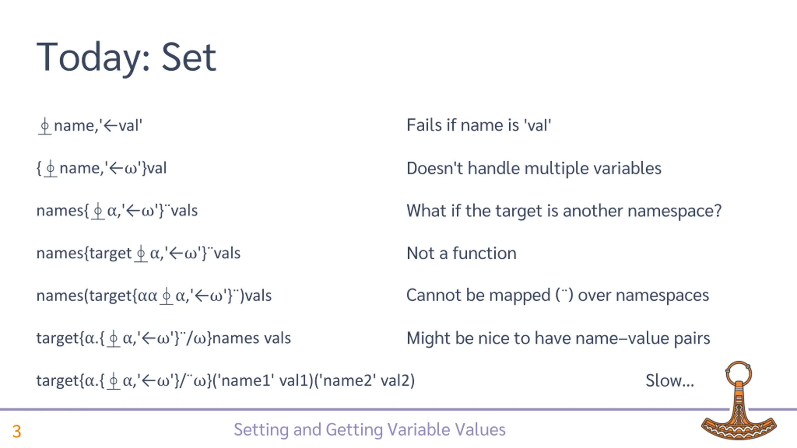 Today: Set Fails if name is 'val' name,' val' Doesn't handle multiple variables { name,' '}val What if the target is another namespace? names{ ,' '} vals Not a function names{target ,' '} vals Cannot be mapped ( ) over namespaces names(target{ ,' '} )vals Might be nice to have name value pairs target{ .{ ,' '} / }names vals Slow target{ .{ ,' '}/ }('name1' val1)('name2' val2) Setting and Getting Variable Values 3