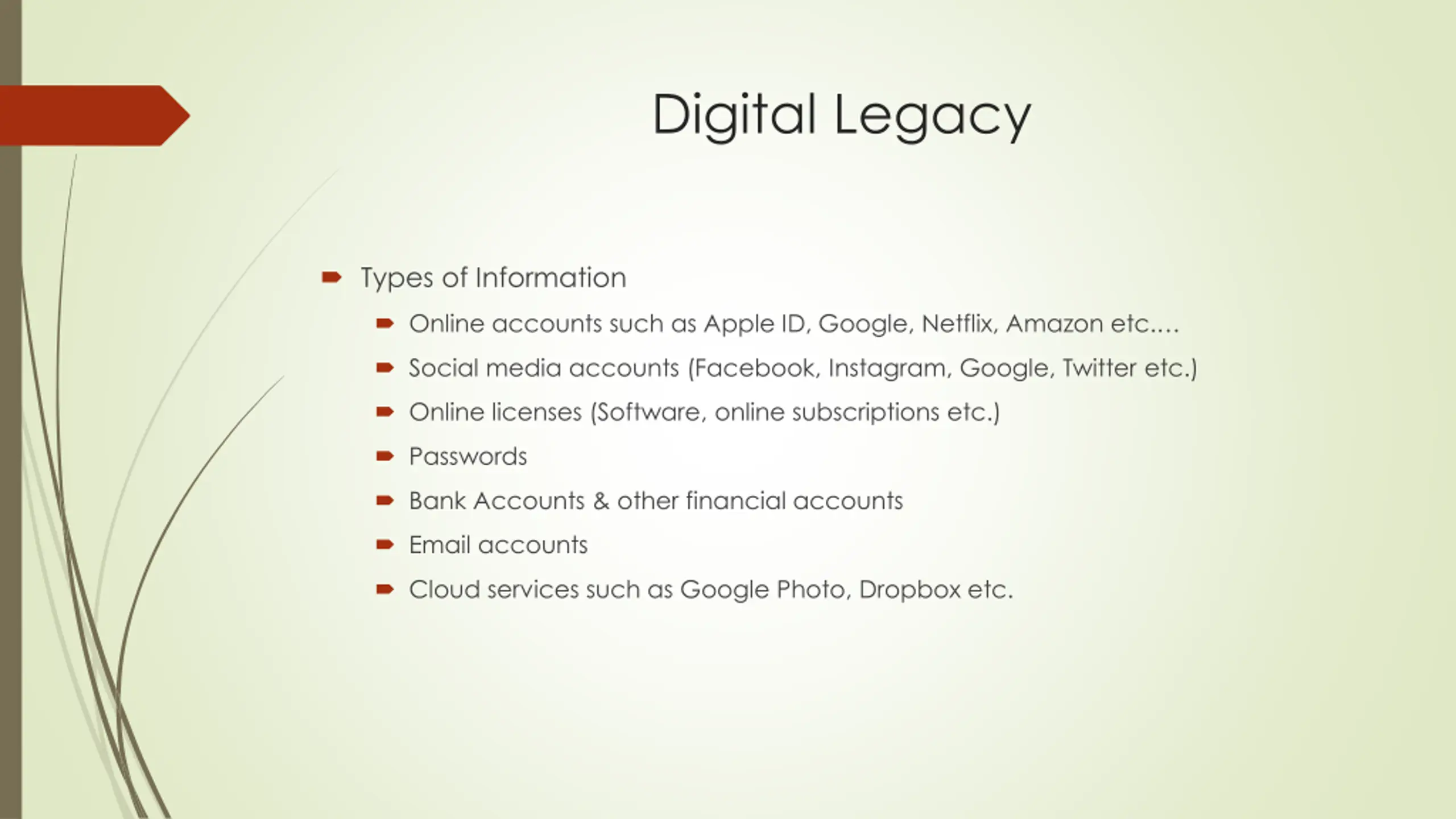 Digital Legacy Types of Information Online accounts such as Apple ID, Google, Netflix, Amazon etc. Social media accounts (Facebook, Instagram, Google, Twitter etc.) Online licenses (Software, online subscriptions etc.) Passwords Bank Accounts & other financial accounts Email accounts Cloud services such as Google Photo, Dropbox etc.