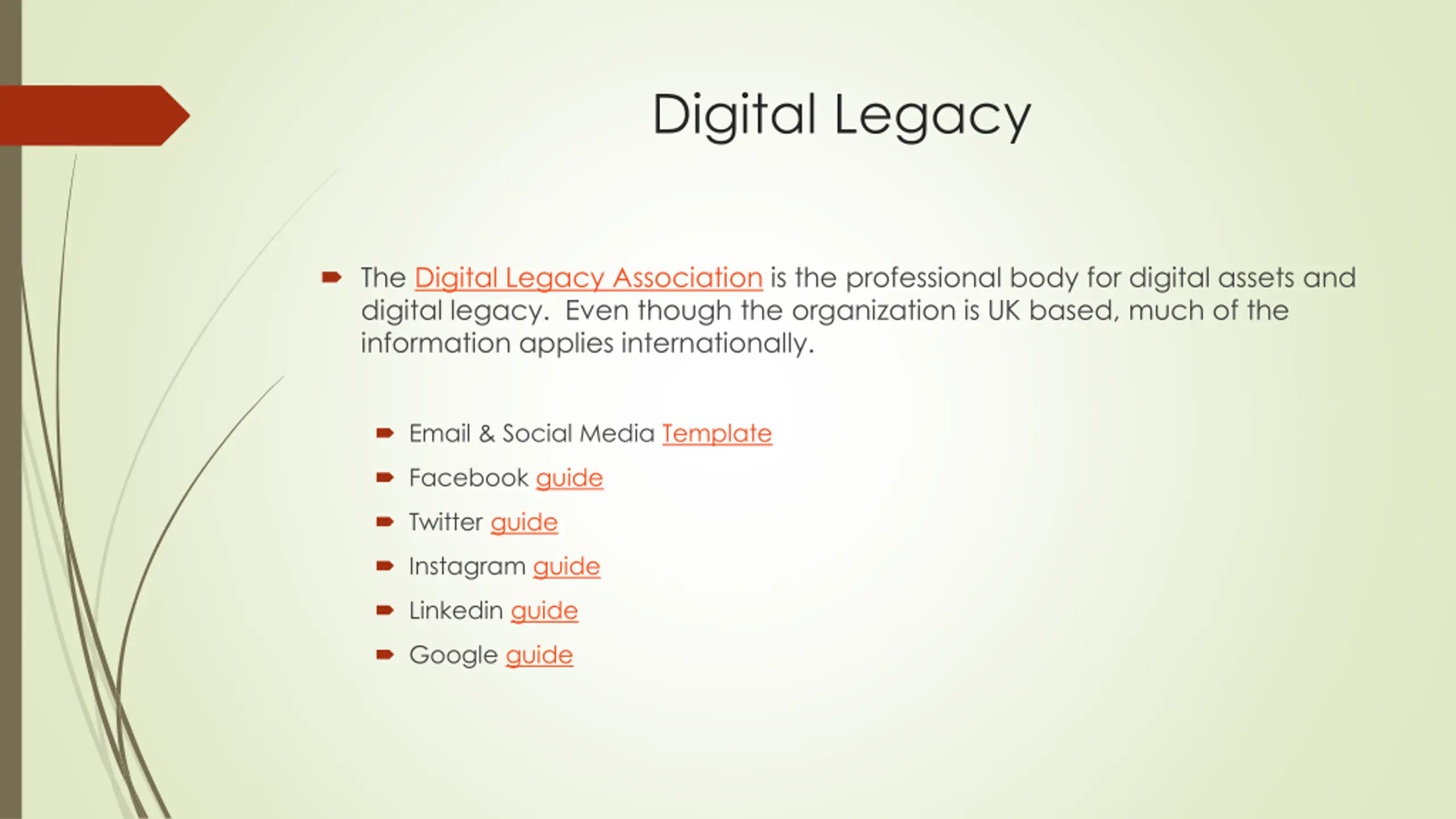 Digital Legacy The Digital Legacy Association is the professional body for digital assets and digital legacy. Even though the organization is UK based, much of the information applies internationally. Email & Social Media Template Facebook guide Twitter guide Instagram guide Linkedin guide Google guide