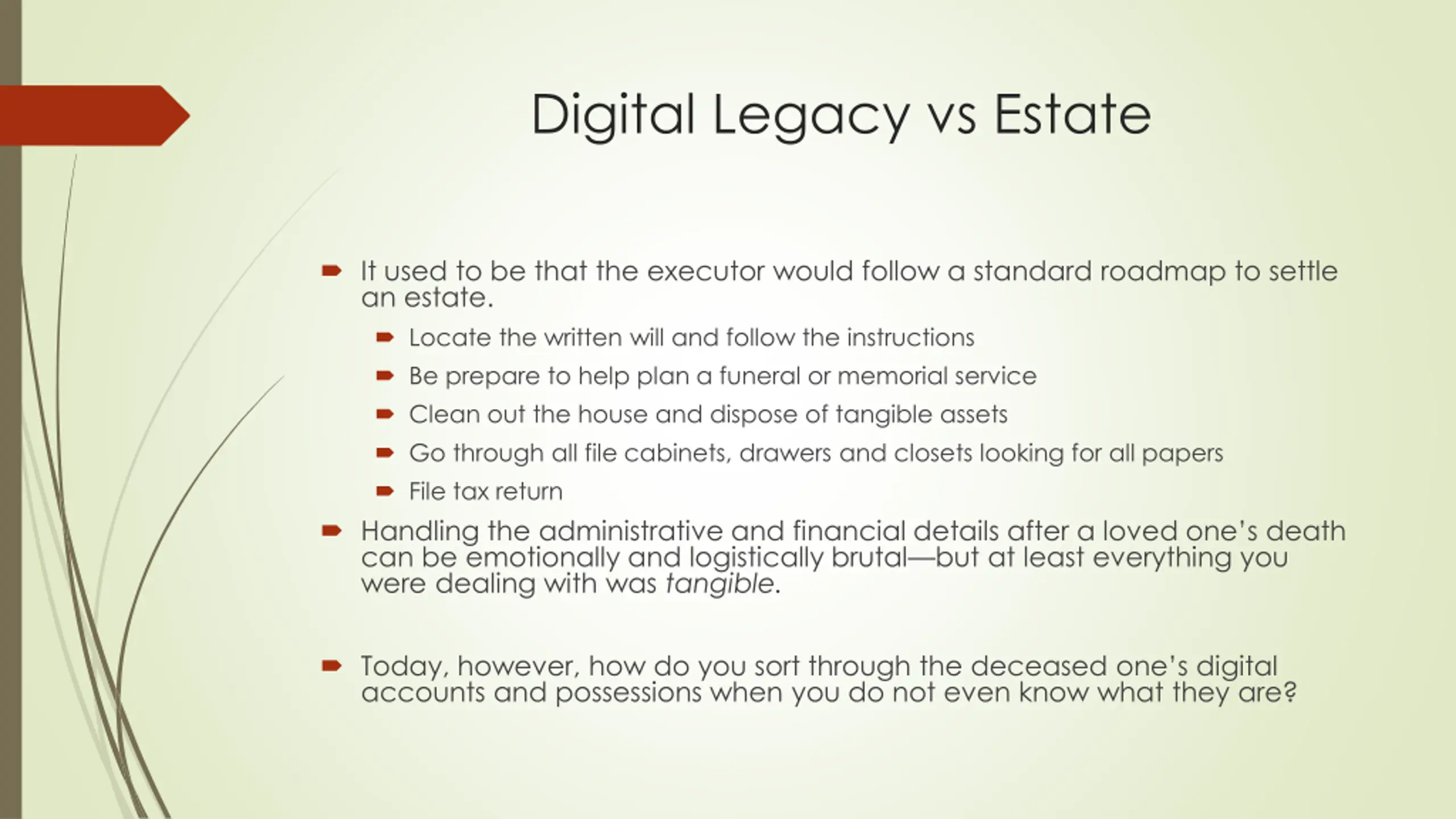Digital Legacy vs Estate It used to be that the executor would follow a standard roadmap to settle an estate. Locate the written will and follow the instructions Be prepare to help plan a funeral or memorial service Clean out the house and dispose of tangible assets Go through all file cabinets, drawers and closets looking for all papers File tax return Handling the administrative and financial details after a loved one s death can be emotionally and logistically brutal but at least everything you were dealing with was tangible. Today, however, how do you sort through the deceased one s digital accounts and possessions when you do not even know what they are?