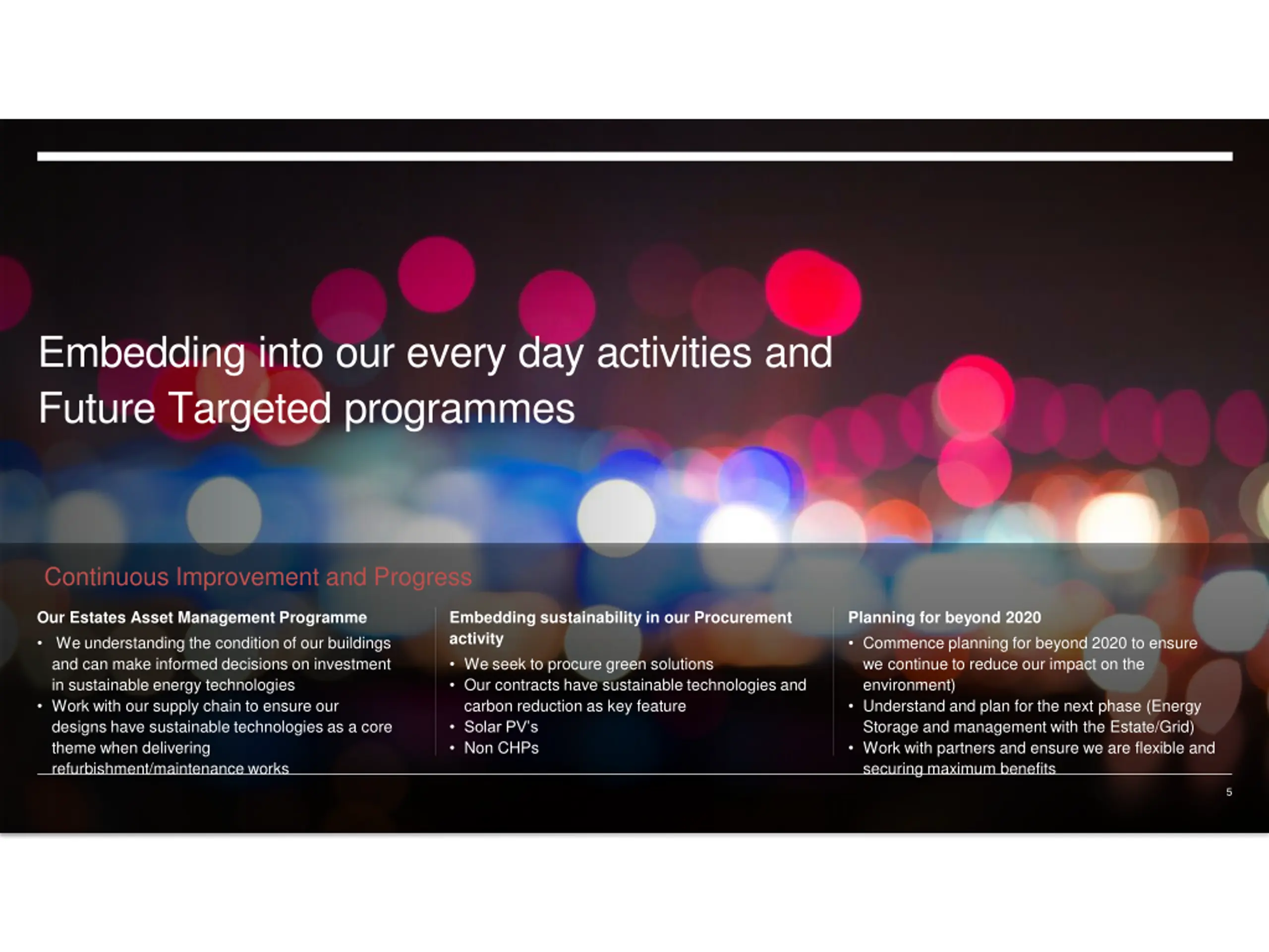 Technologies and Locations High Level Business Case Development Locations Understanding the condition of our buildings and where to invest in sustainable energy technologies Understanding other programmes of work and where there was a synergy Understanding where there were contractual issues to be resolved Technologies to be Retrofit LEDs CHPs Solar PV s Non CHPs Controls/Building Management Systems Invest to Save assessments Initial high level assessments, but underpinned by feasibility studies. Individual Business Cases to support the case by case investment models Ongoing monitoring to ensure carbon and financial savings are achieved and to inform future programmes of carbon reduction activity 4