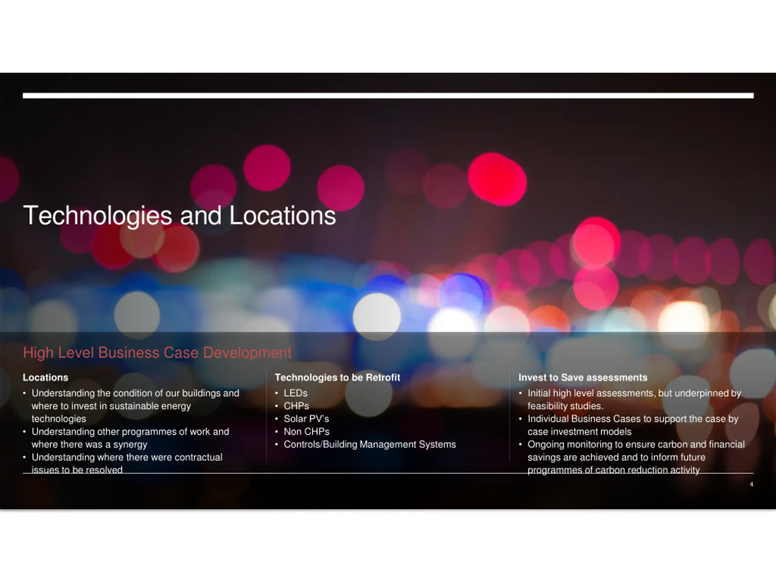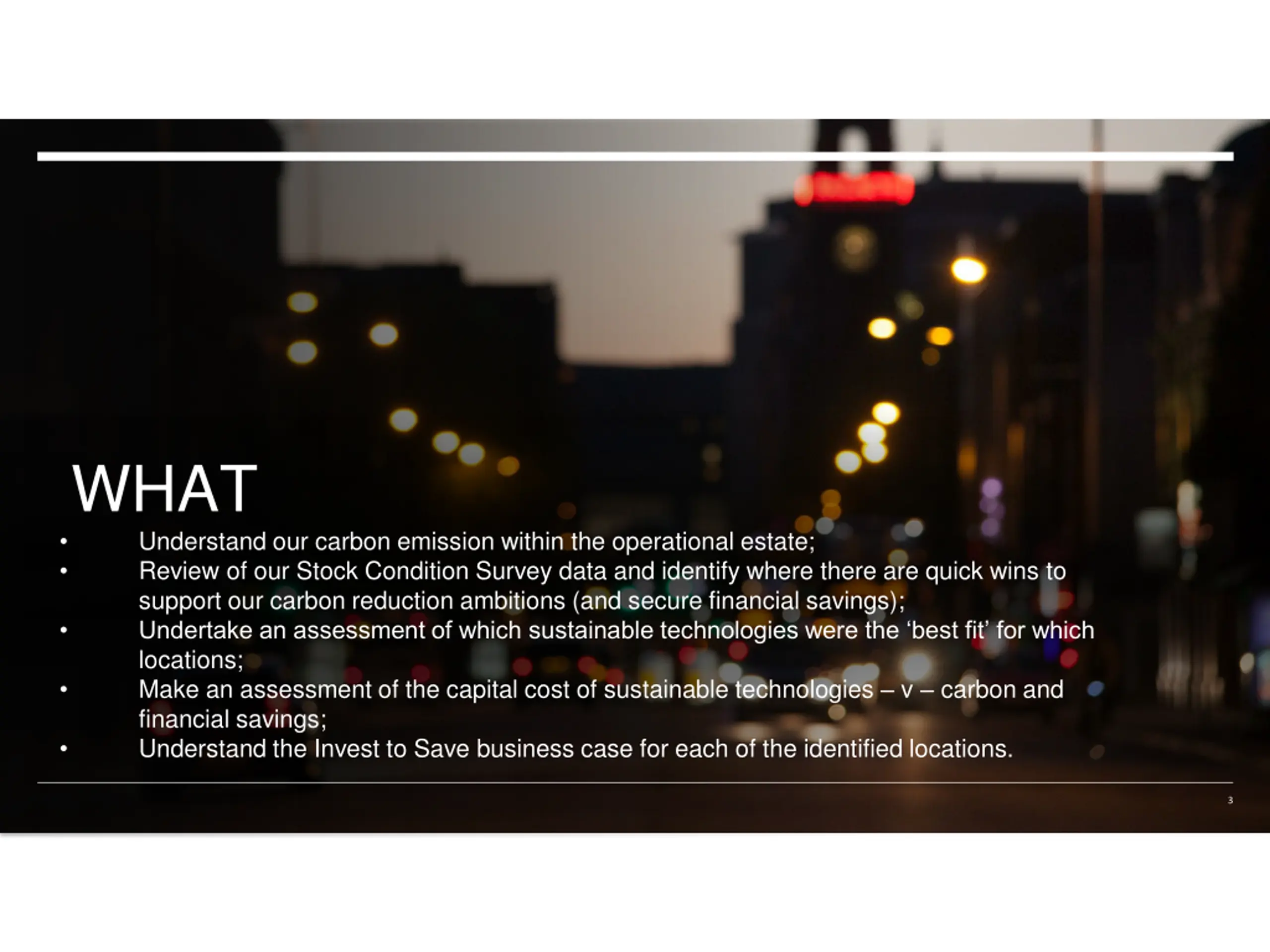 WHAT Understand our carbon emission within the operational estate; Review of our Stock Condition Survey data and identify where there are quick wins to support our carbon reduction ambitions (and secure financial savings); Undertake an assessment of which sustainable technologies were the best fit for which locations; Make an assessment of the capital cost of sustainable technologies v carbon and financial savings; Understand the Invest to Save business case for each of the identified locations. 3